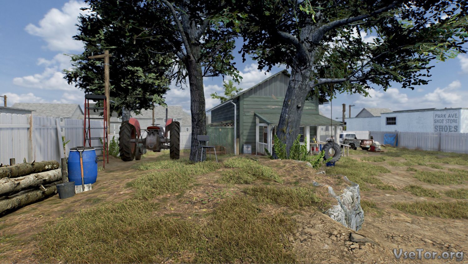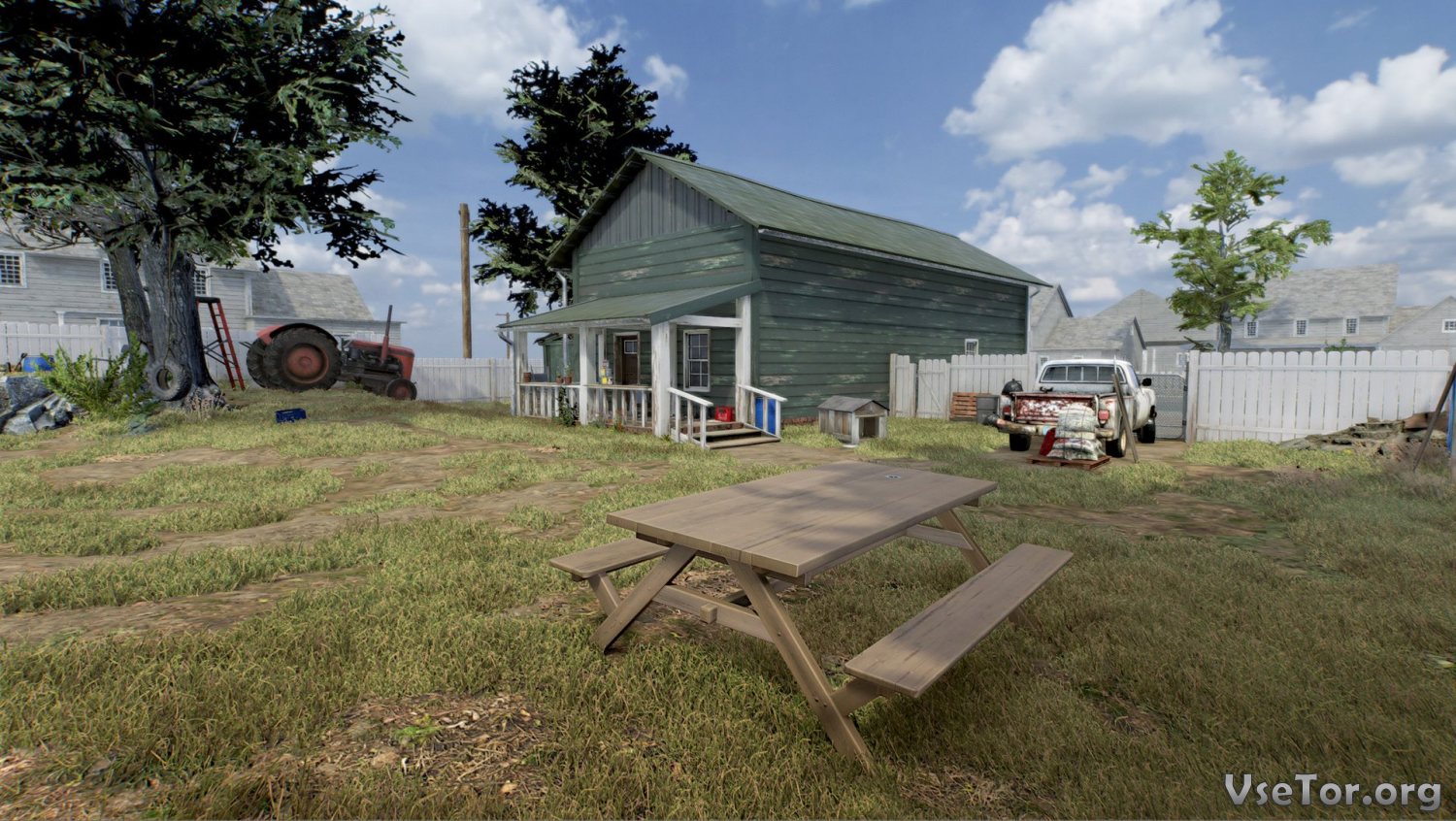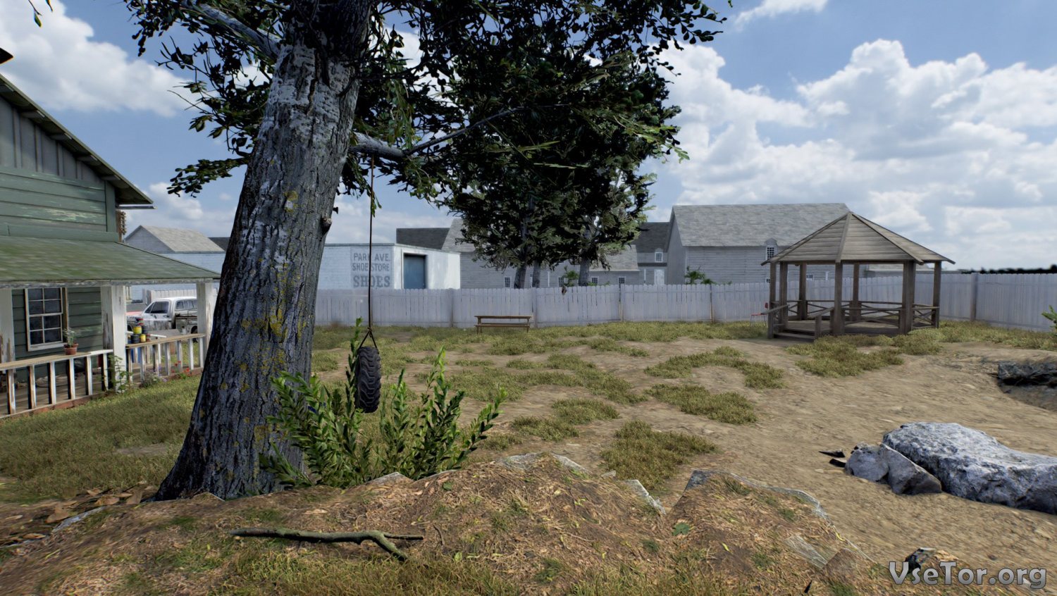 Окружение же интерактивное. Сам двор не слишком-то и велик, но на его просторах имеется много предметов, с которыми вы сможете взаимодействовать. Например, вы можете найти на дворе мячик и просто покидать его собаке. Она будет бегать за ним и приносить его вам обратно в руки. Еще есть шина, висящая на веревке, привязанной к дереву. Вы можете дать собаке команду вцепиться в шину, или попробовать прыгнуть через нее. И точно также тут имеется еще и много других предметов, с которыми вы также можете взаимодействовать.