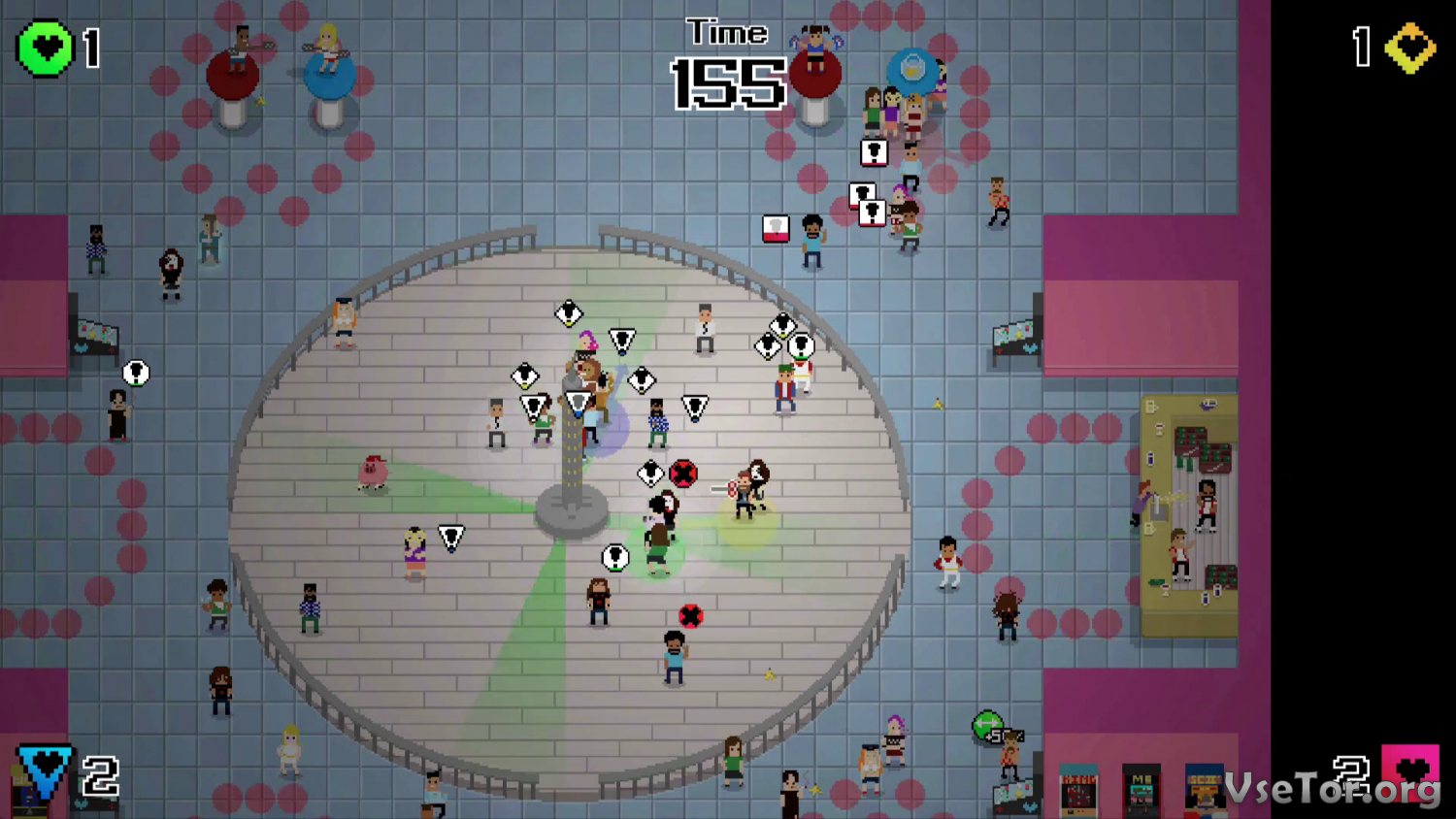 Что же касается игрового процесса, так тут все довольно просто. В основе всего тут лежит простая механика, чем-то похожая на ту, что используется в игре «Змейка». Только тут есть одно небольшое отличие, которое заключается в постоянно играющей веселой музыке, и «змейке», состоящей из людей, танцующих в один ритм и старающихся овладеть сердцами других людей. Все, что вам нужно, это ворваться на танцпол и начать кружиться вокруг человека, пока он не присоединится к вам, а затем отправиться за следующим, и затем за новым, и так далее. В конечном итоге строй может достигнуть таких размеров, что даже просто передвигаться по площадке будет крайне сложно. Но учтите тот факт, что вам ни в коем случае нельзя допускать столкновений с людьми, иначе они отвернутся от вас, или произойдет и вовсе самое худшее – строй распадется.