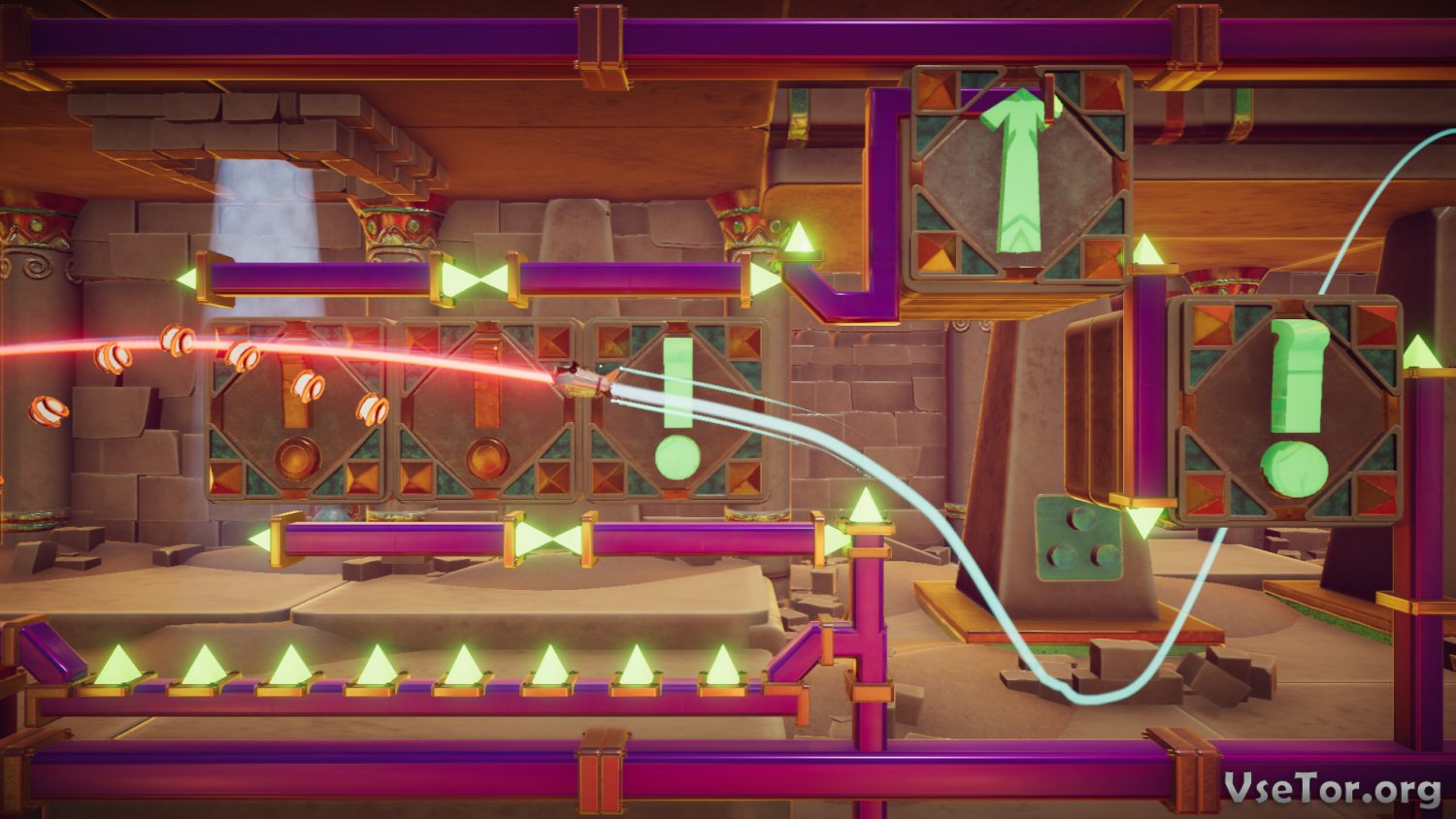 Что касается игрового процесса, так он тут весь необыкновенен, ведь предлагает то, чего до этого еще не было ни в одной из игр. Суть в том, что здесь перемещаться по уровням вы сможете лишь по маршруту, что указывается специальным лучом. Вы же можете видоизменять этот маршрут, используя управление осями и меняя направление, создавая волны, закручивая луч в спирали, и не только. И вот в такой нехитрый способ вы и должны будете проходить уровни. Звучит сложно, но на деле все намного проще и интереснее.