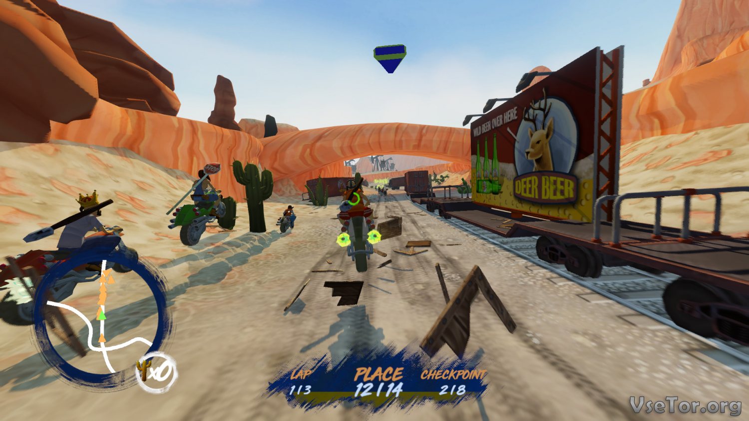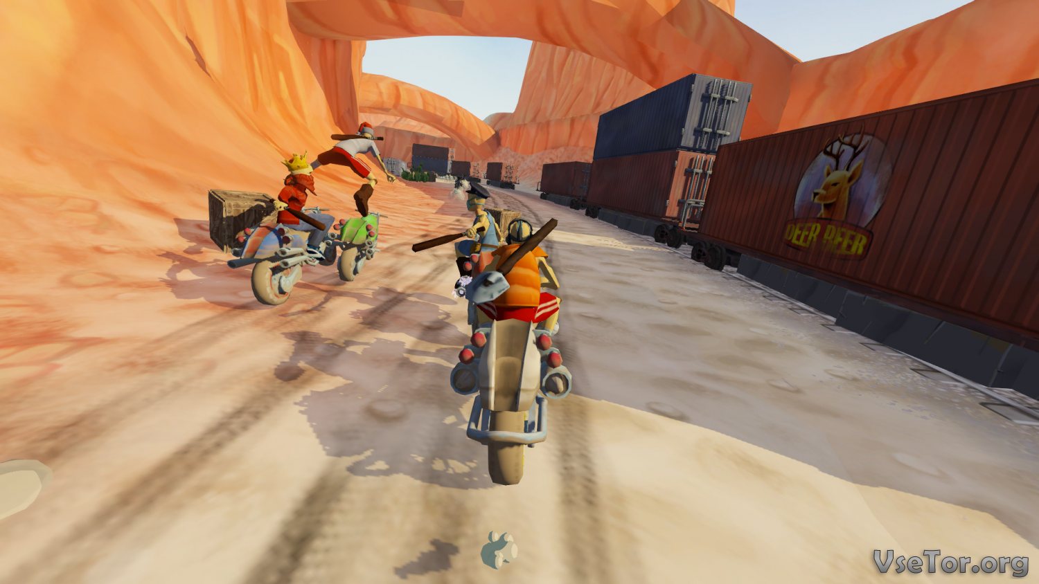 Вообще можно сказать, что эта игра совместила в себе сразу несколько жанров. Во-первых, тут вам будет типичная гонка по бездорожью, в которой будут и трамплины, и кочки, на которых вы будете взлетать верх, и разнообразные преграды, и многое другое. Во-вторых, это гонка на выживание. От этого жанра игра взяла самое главное – сражения. В ходе гонки вы можете бить своих противников оружием ближнего боя по голове, пихать их, сбивать, толкать, и не только. Ну а в-третьих, это еще и экстремальный симулятор. В общем, играть в нее действительно интересно.
