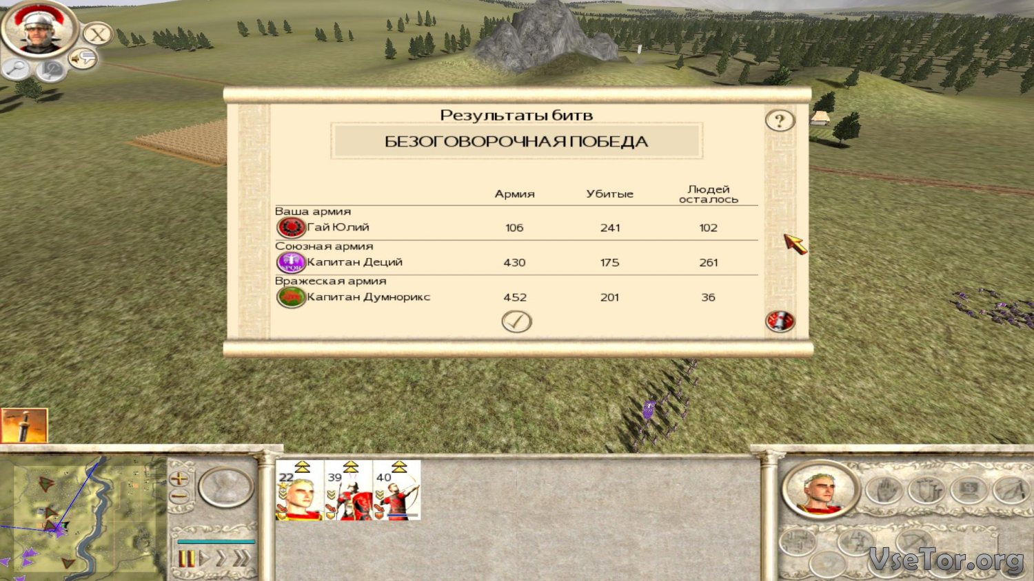 Ну а первым делом стоило бы сказать о том, что в Rome: Total War вас ждут уже куда более глобальные сражения, в которых могут участвовать сразу тысячи воинов. Масштабность тут зашкаливает, прорисовка сражений и одновременно сразу кучи солдат просто невероятна, реалистичность и детализация таковы, что позволят вам прочувствовать по полной все то, что происходит тут на поле боя.