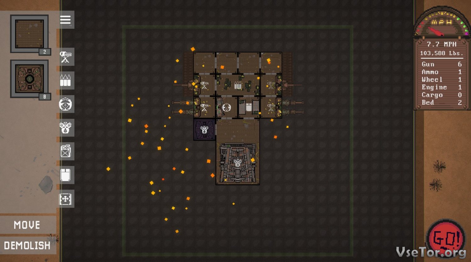 Ну а начинать в этой игре вам придется со сборки собственного транспортного боевого средства, а скорее даже крепости, ведь именно крепость в итоге и будет напоминать ваш транспорт. Причем, сборке придется уделить достаточно много времени, ведь тут от того, как выглядит конструкция. где расположены разные модули и отсеки, и как они крепятся друг к другу, будет зависеть, сколько вы проживете на пустошах. И лучше не недооценивать врагов – поверьте, они вас не пожалеют.
