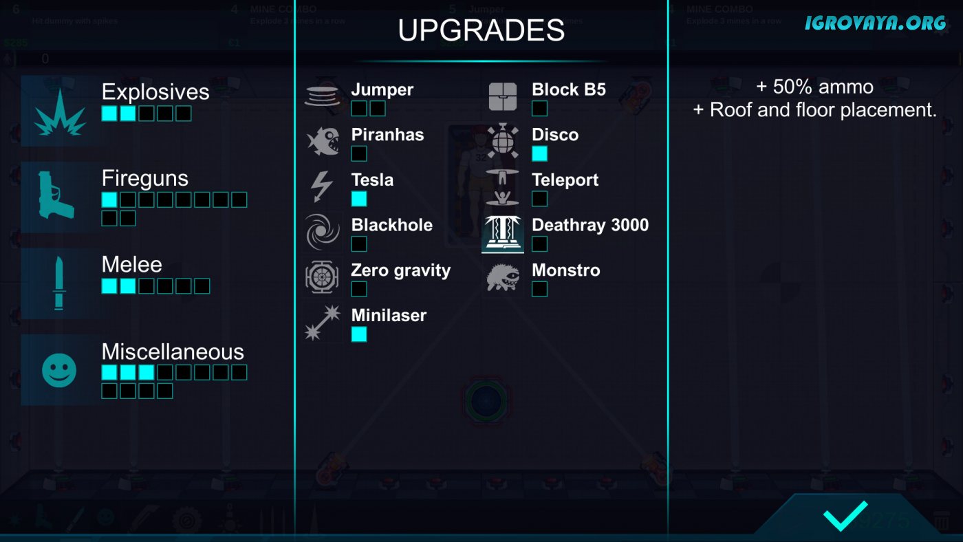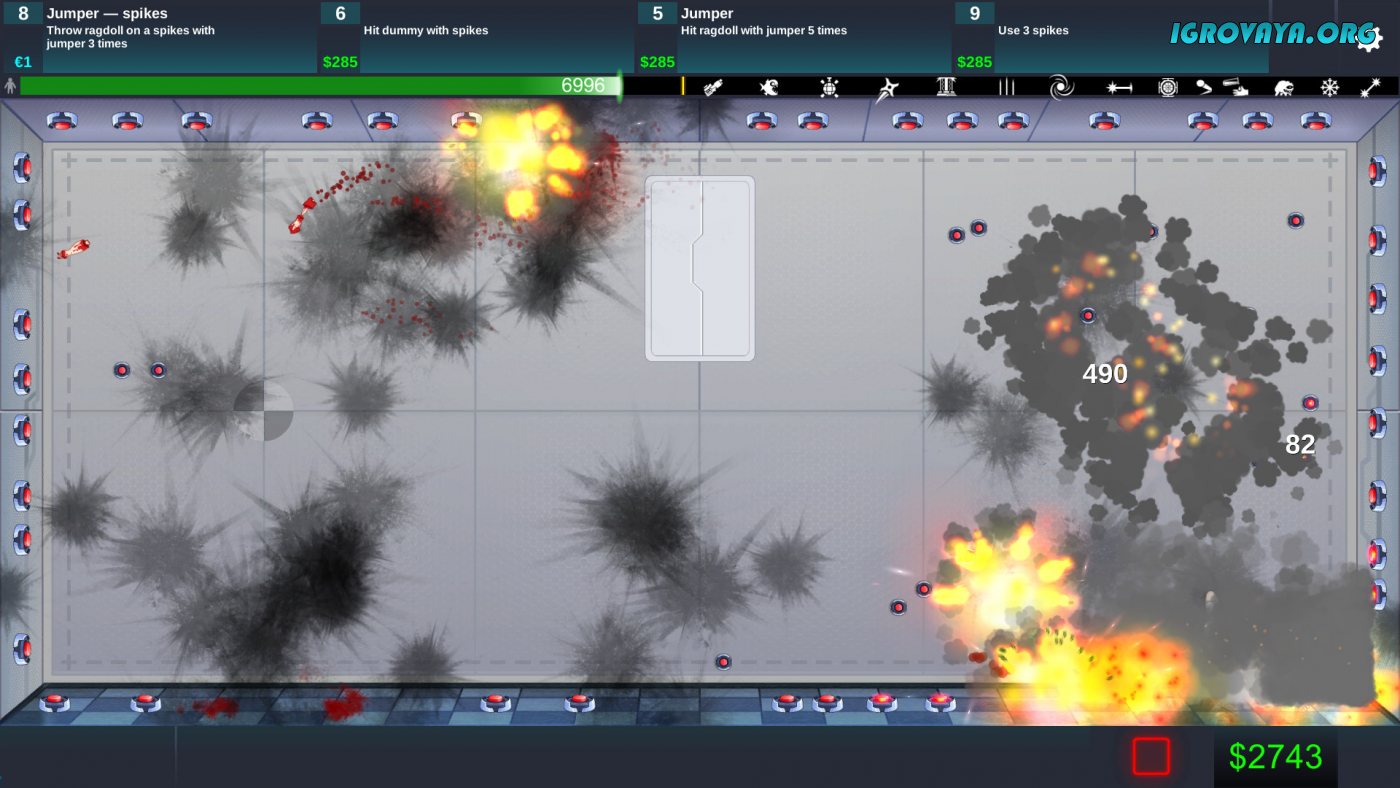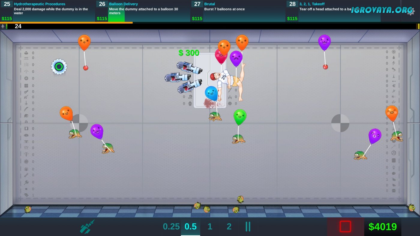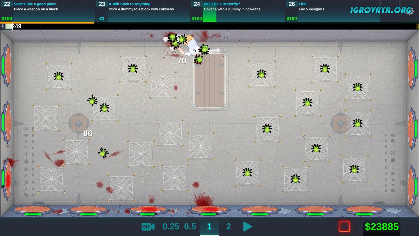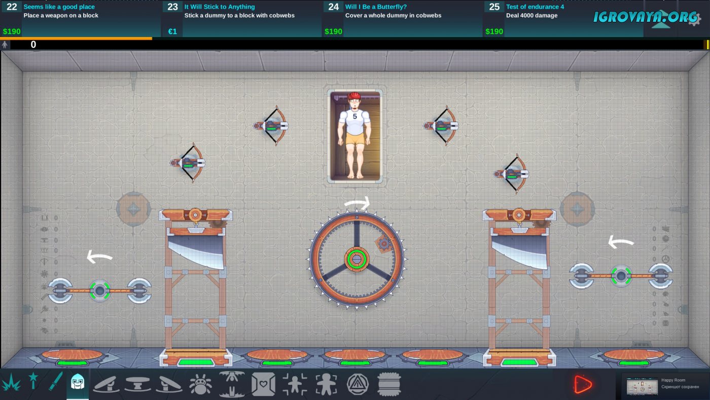 Убивать же в Happy Room можно сотнями и тысячами самых разных способов. В самом начале в вашем распоряжении будет лишь наипростейшее оружие: биты, колья, мечи, лезвия и многое другое. С помощью всего этого вы сможете создавать циркуляционные пилы, выскакивающие из пола и потолка, ловушки с кольями, бьющие клона пугала и не только. Чем красивее будет умирать клон, тем больше очков за его убийство вы получите. Очки же можно будет потратить на покупку новых видов вооружения, примочек, гаджетов и ловушек.