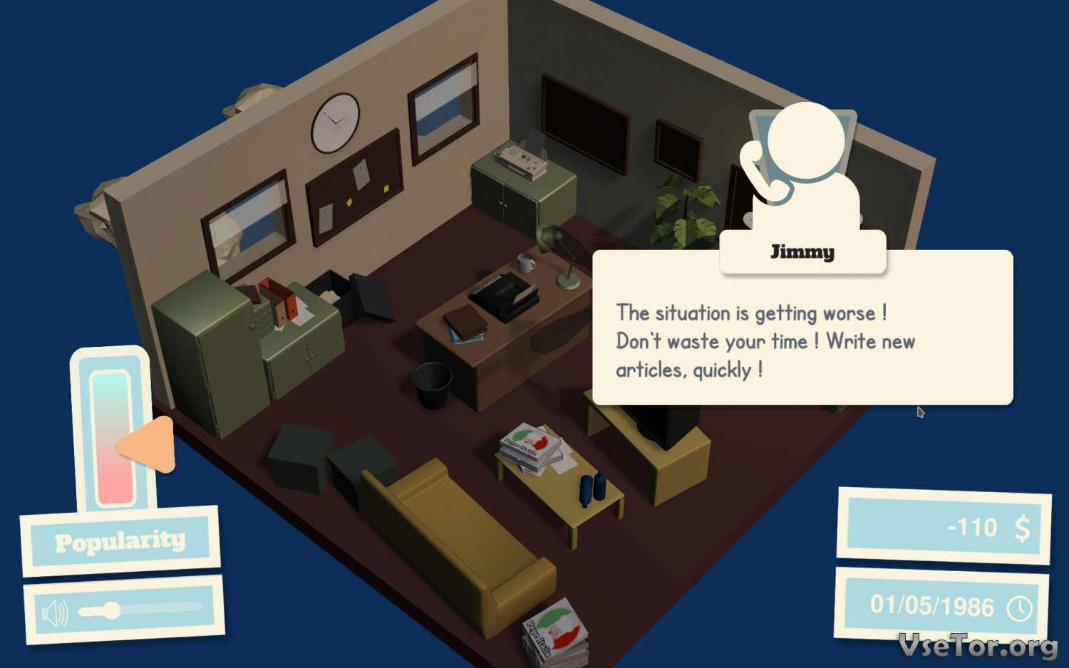 По своей сути, это простая игрушка, симулятор, в котором вы станете журналистом 90-х. Сначала вы станете обычным честным журналистом, которому лишь хочется стать известным, но потом вы начнете творить такое, что трудно и представить даже в нашей реальности. Вы будете продавать статьи и новости, распространять фейки и представляющуюся вам пропаганду, манипулировать новостями, и делать многое-многое другое.