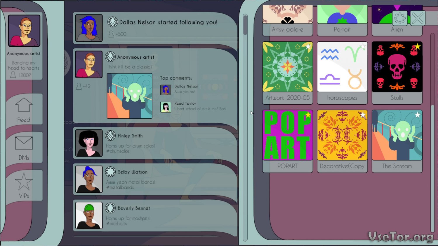 Создавая произведения искусства, вы сможете выкладывать их в здешние социальные сети и хвастаться ими перед конкурентами. Попутно вы будете получать поклонников, фолловеров, и не только. Таким вот непростым способом вы будете становиться известным и популярным. Ну а дальше все, как и в любом другом симуляторе. Развивайтесь, повышайте уровень популярности, создавайте новые шедевры и просто получайте удовольствие от игры.