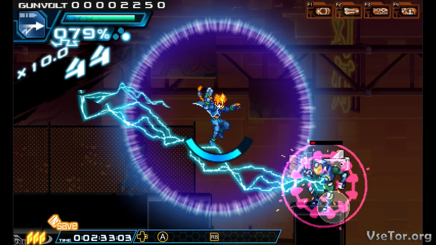Ганвольт обладает множеством уникальных способностей, которые вы сможете использовать в сражениях с врагами. Например, он может стрелять во врагов стрелами-громоотводами из специального пистолета, может быть врагов мощными электрическими разрядами, совершать атаки по сразу нескольким врагам, выполнять крутые маневры, и не только. И ведь это герой с еще не раскрытыми способностями, и по ходу прохождения вы сможете сделать его куда более сильным и мощным.