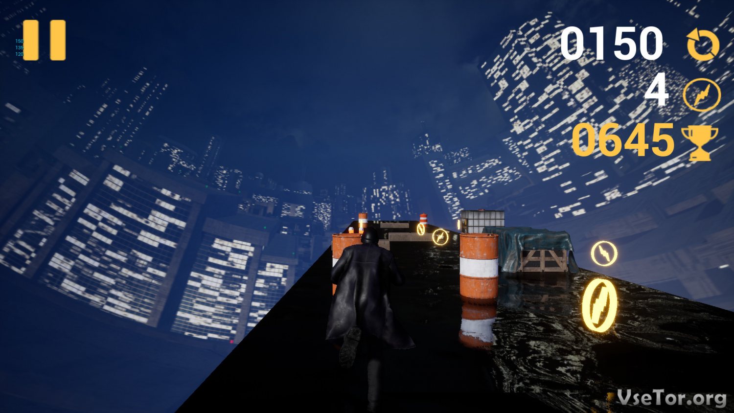 Разнообразия на данный момент в CityRunner не так уж и много, но даже того, что есть, вам хватит для того, чтоб как полагает провести время. К тому же. даже на той единственной трассе, что тут есть, царит вполне приятная атмосфера – вокруг горят огни города будущего, все сверкает, и царит приятная атмосфера. Бегите вперед, собирайте пиктограммы, устанавливайте рекорды. накапливая очки рейтинга, и просто получайте удовольствие от забега. У нас вы можете скачать CityRunner торрент последнюю версию бесплатно на компьютер.