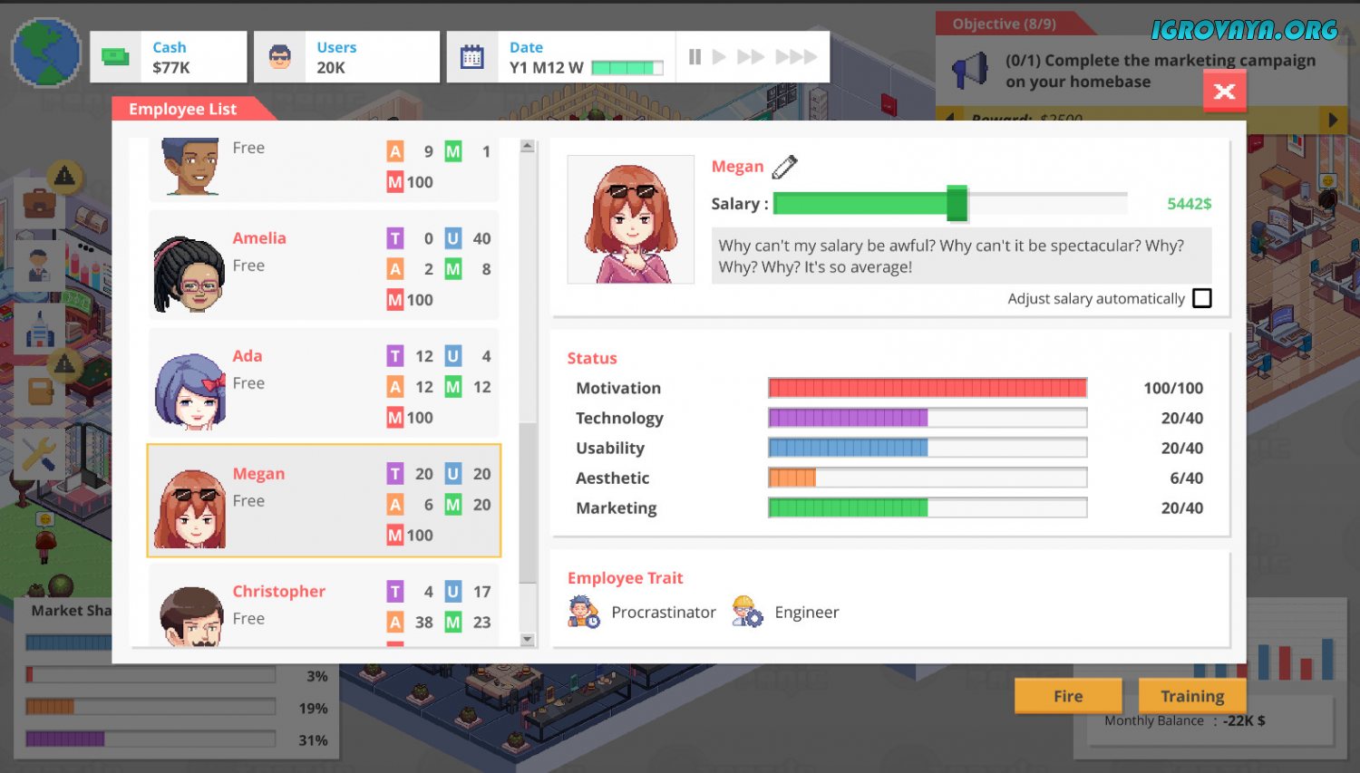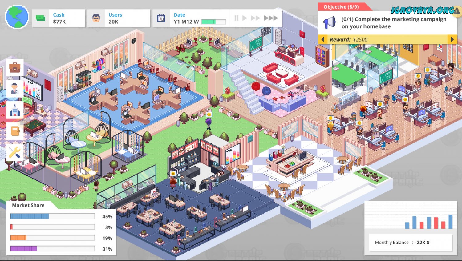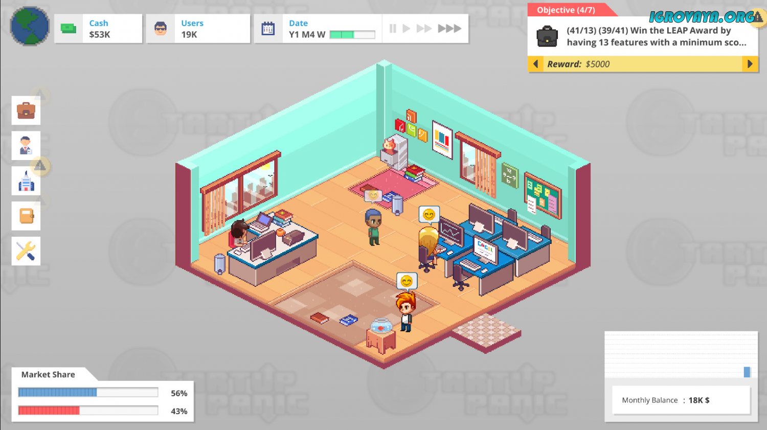 Теперь вам придется расшириться, построить офис, обставить его в соответствии со всеми стандартами, создать комфортную обстановку и нанять специалистов, которых в свою очередь нужно будет распределить по группам. Думаете это легко? Поверьте, вы не правы! Во-первых, каждый специалист по-своему уникален и имеет уникальные характеристики. Во-вторых, многое будет зависеть от вашего отношения к работникам. Ну а в-третьих, не забывайте о конкуренции – а ведь конкуренты никогда не составят вас в покое. У нас вы можете скачать Startup Panic торрент последнюю версию бесплатно на компьютер.