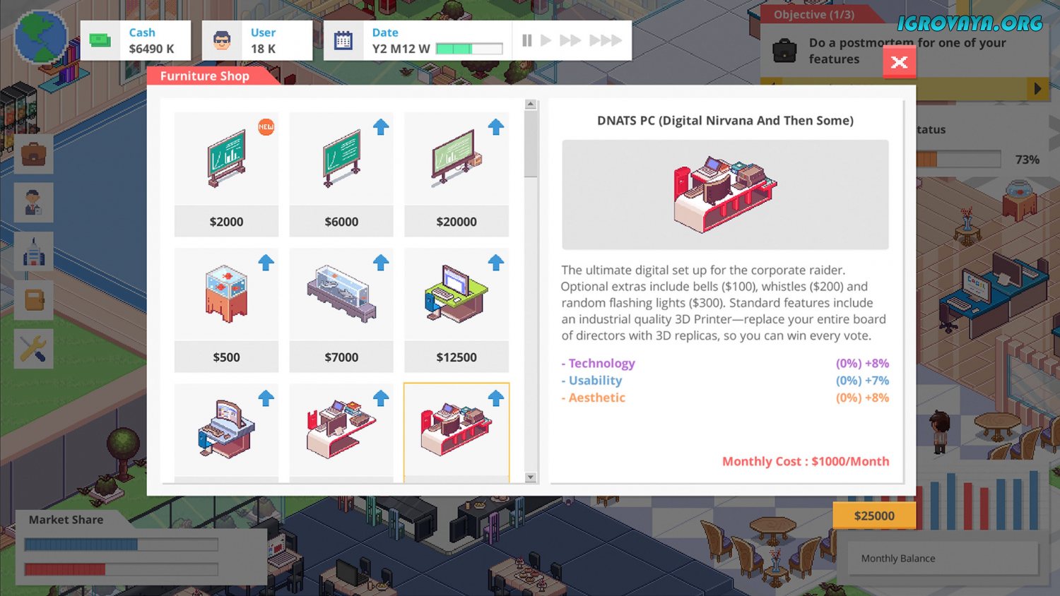 Но начинать вам придется с малого. Сначала вы будете простым рядовым работником обычной компании, но внезапно ваш герой решит начать свое дело, и вот тут-то и начнется все самое интересное. Но не стоит сразу хвататься за разработку программ – в первую очередь вам придется позаботиться о рабочем месте. Вы будете начинать работу с небольшой суммой денег и маленьким помещением, в котором не будет места, ни микроволновой печке, ни даже автомату с газировкой. Компьютер, рабочий стол и помещение размером в ванную комнату – вот ваше первое рабочее место.