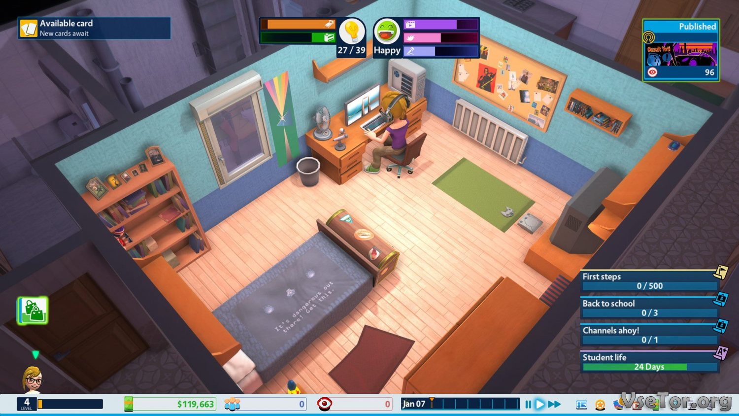 Развивайтесь, приобретайте новые гаджеты и улучшайте свое рабочее место, выполняйте специальные задания, за которые вам будут начисляться бонусы, прокачивайте свое мастерство и завоевывайте сердца пользователей всеми возможными способами. Здесь никто не сможет вас остановить, главное, старайтесь удивлять людей и монтируйте побольше интересных видео. Но не забывайте и о социальной составляющей жизни вашего героя… У нас вы можете скачать Youtubers Life торрент последнюю версию бесплатно на компьютер.
