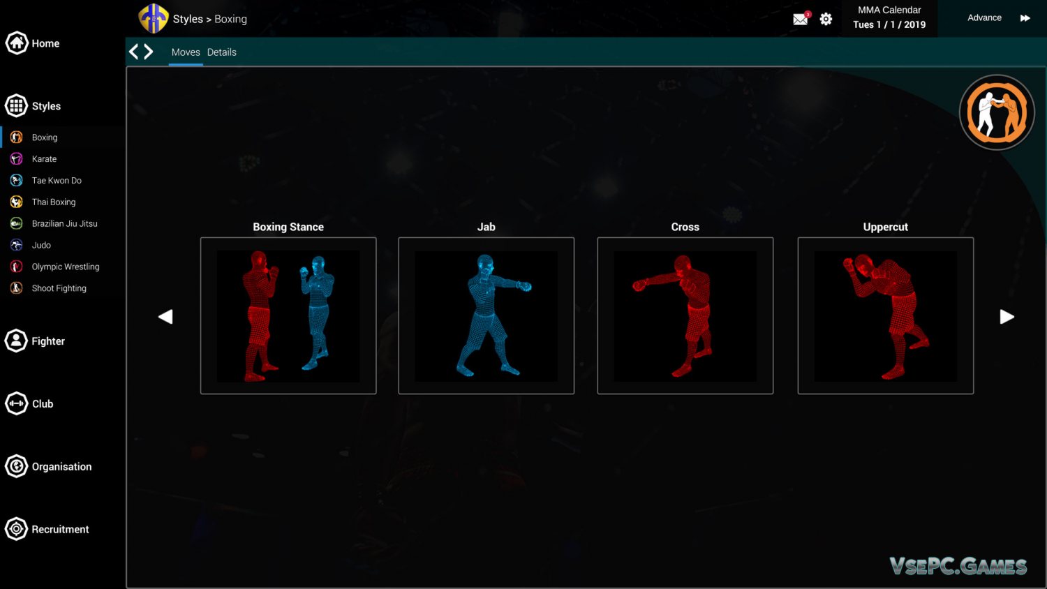 Конечно, придется заниматься и тренировками. Например, вы должны будете тренировать своих бойцов, чтоб они всегда оставались в форме, даже в межсезонье. Плюс, вы должны будете вместе с ними оттачивать навыки, изучать новые стили, исследовать новые приемы и захваты, и делать многое другое. Далее вы сможете оценивать бойцов и даже направлять их на курс осваивания новых стилей и видов боевых искусств (бокс, тайский бокс, и т.п.).