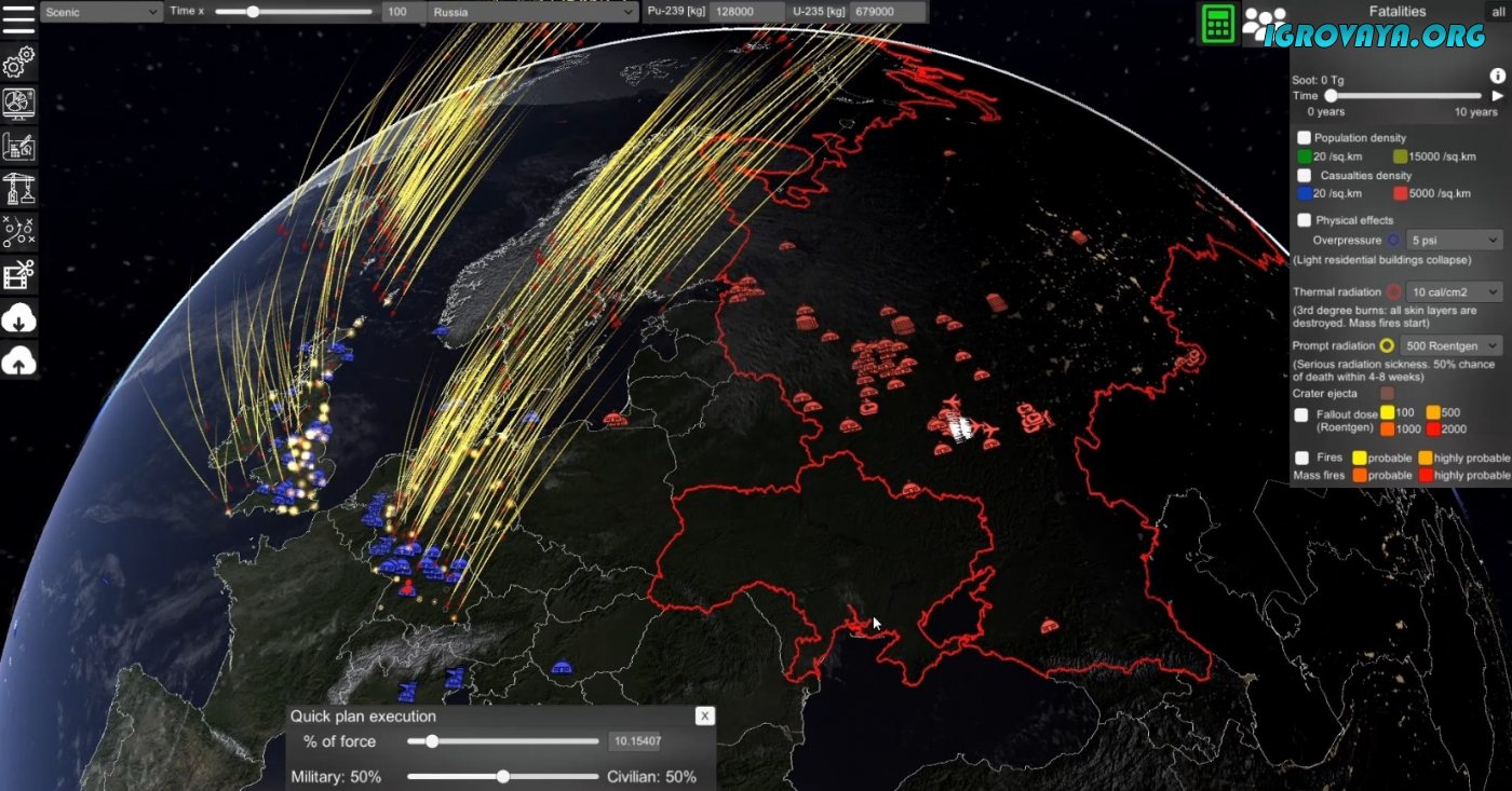 Теперь в вашем распоряжении вся поверхность нашей планеты и вы можете смоделировать ядерную войну, конфликт стран, и выяснить, что будет происходить в тот момент, когда страны начнут запускать в небо свои ядерные ракеты и уничтожать друг друга, и как затем будет развиваться ситуация в мире. Что будет, если конфликт разгорится ядерным пламенем между Америкой и Россией, или Китаем и Индией, к примеру? Как будет развиваться ситуация, и как пострадают страны и весь мир в целом от такой войны? Вот это-то вы теперь и сможете выяснить.
