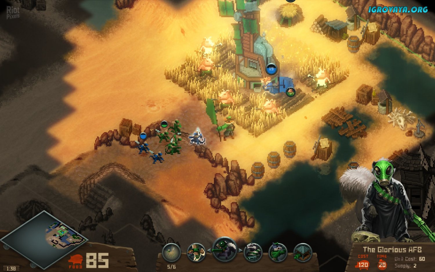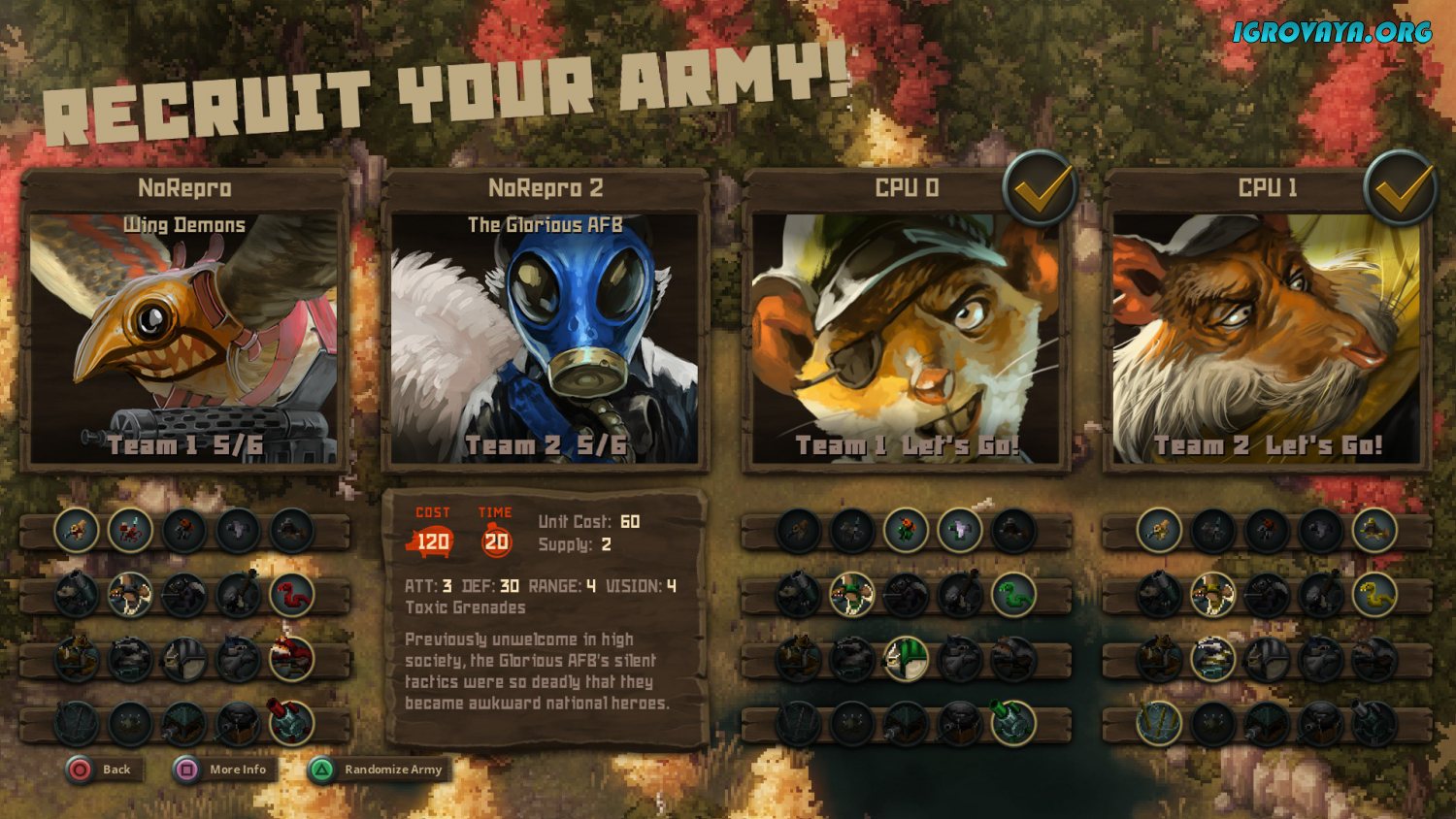 Юниты – разновидностей юнитов столько, что глаза разбегаются, но все по-своему уникальны и выполнены в юмористичном стиле. Например, вам будут доступны кабаны-огнеметчики, десантные совы, и даже «токсичные» скунсы, способные отравить и ослабить противника. В общем, разнообразие налицо, да и скучать не придется – сражения сражениями, а юмору тут уделено не меньшее внимание.