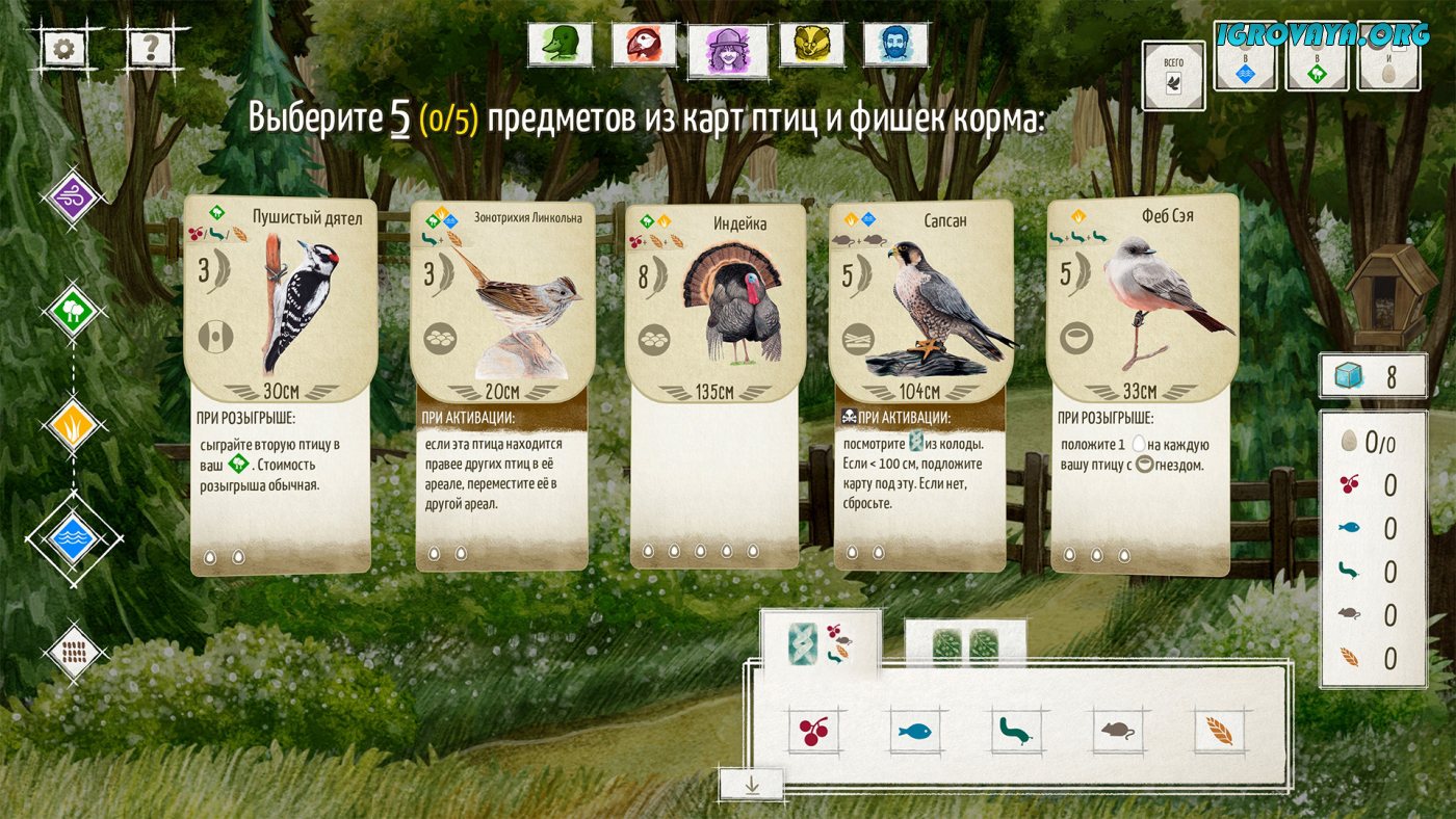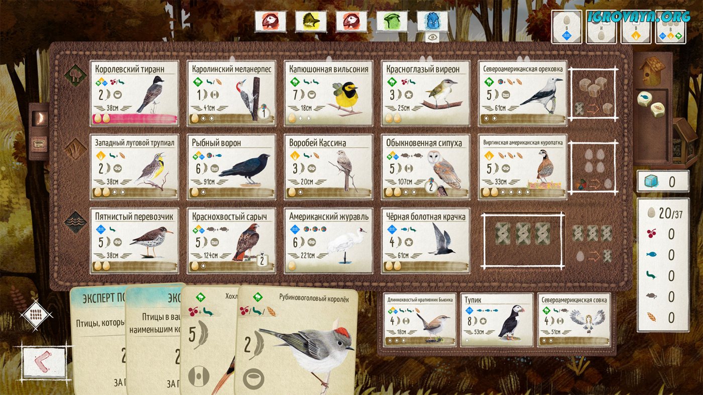 Кстати, в эту игру можно играть не только в одиночку, но также и в кооперативе с друзьями. Игра поддерживает многопользовательский режим игры с пятью пользователями, что довольно круто, ведь в этом режиме игроки могут соревноваться, пытаясь создать лучший заповедник. А еще в Wingspan вас ждет море уникальных анимированных птиц, реальные запись звуков природы, и очень приятная атмосфера. У нас вы можете скачать Wingspan (Крылья) торрент последнюю версию бесплатно на компьютер.