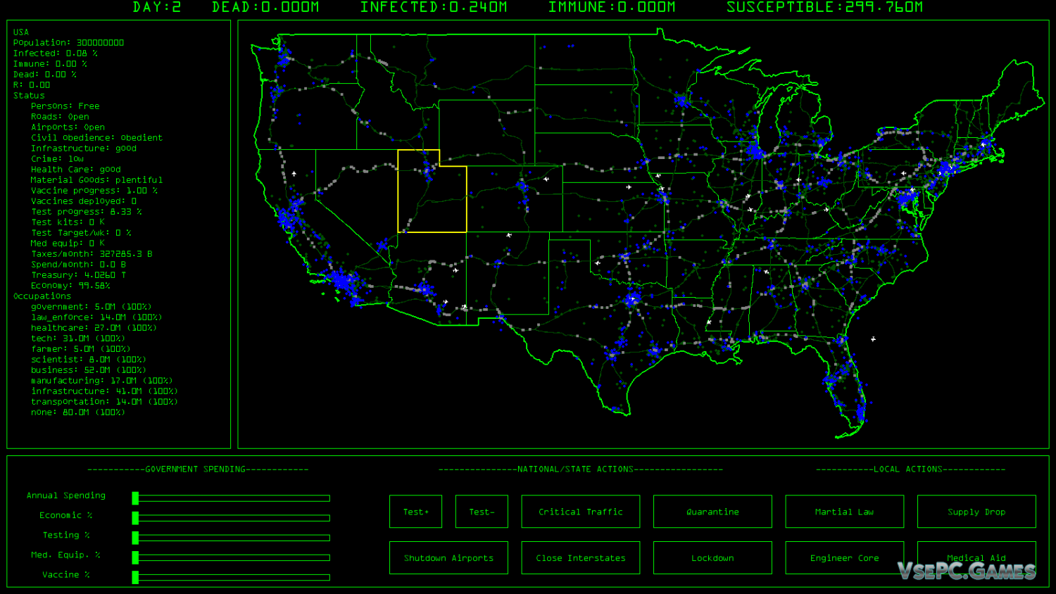 События игры происходят на территории Соединенных Штатов Америки прямо во время пандемии Коронавируса. Страна охвачена вирусом и паникой, больницы переполняются зараженными, люди умирают, и нация теперь находится в опасности. ну а вам же в это нелегкое время предстоит сыграть роль человека, который будет стоять за всеми правительственными решениями. Теперь вы отвечаете за страну, нацию, и количество умерших, и теперь вам придется спасать нацию, пока не стало слишком поздно. И поверьте, будет очень нелегко…