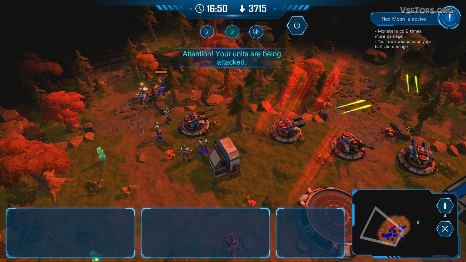 Выжить и отразить атаки врагов вам помогут технологии, оборонительные башни, и юниты, которых вы сможете тренировать. ресурсы же, которые вы соберете на уровне, можно будет потратить на исследование новых технологий, а остатки ресурсов, которые окажутся в вашем распоряжении после прохождения уровня, можно будет потратить на разблокировку новых технологий или улучшений для башен.