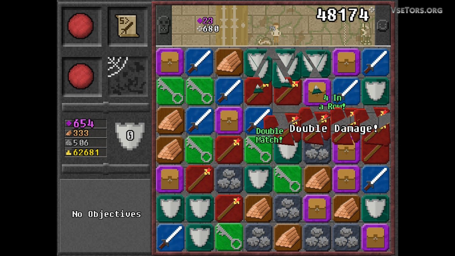Суть в том, что при схватке с врагом, от того, какие символы вы соберете в ряд, будет зависеть, как именно будет происходить сама схватка. Вы можете собрать посохи и нанести урон мощной атакой посохом, а можете собрать мечи, щиты, или еще что. Каждый символ отвечает определенным свойствам и действиям главного героя.