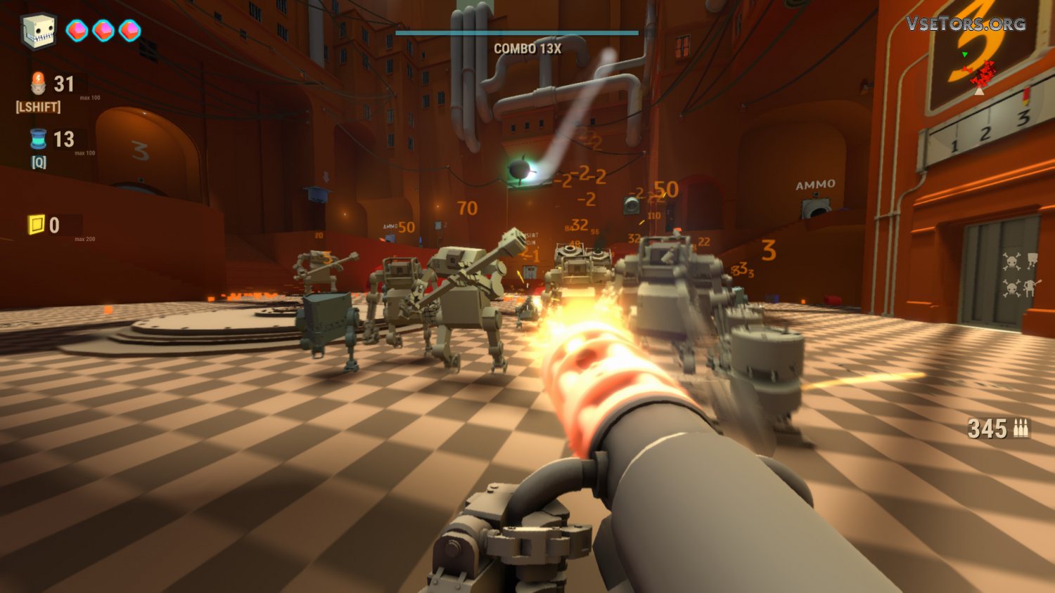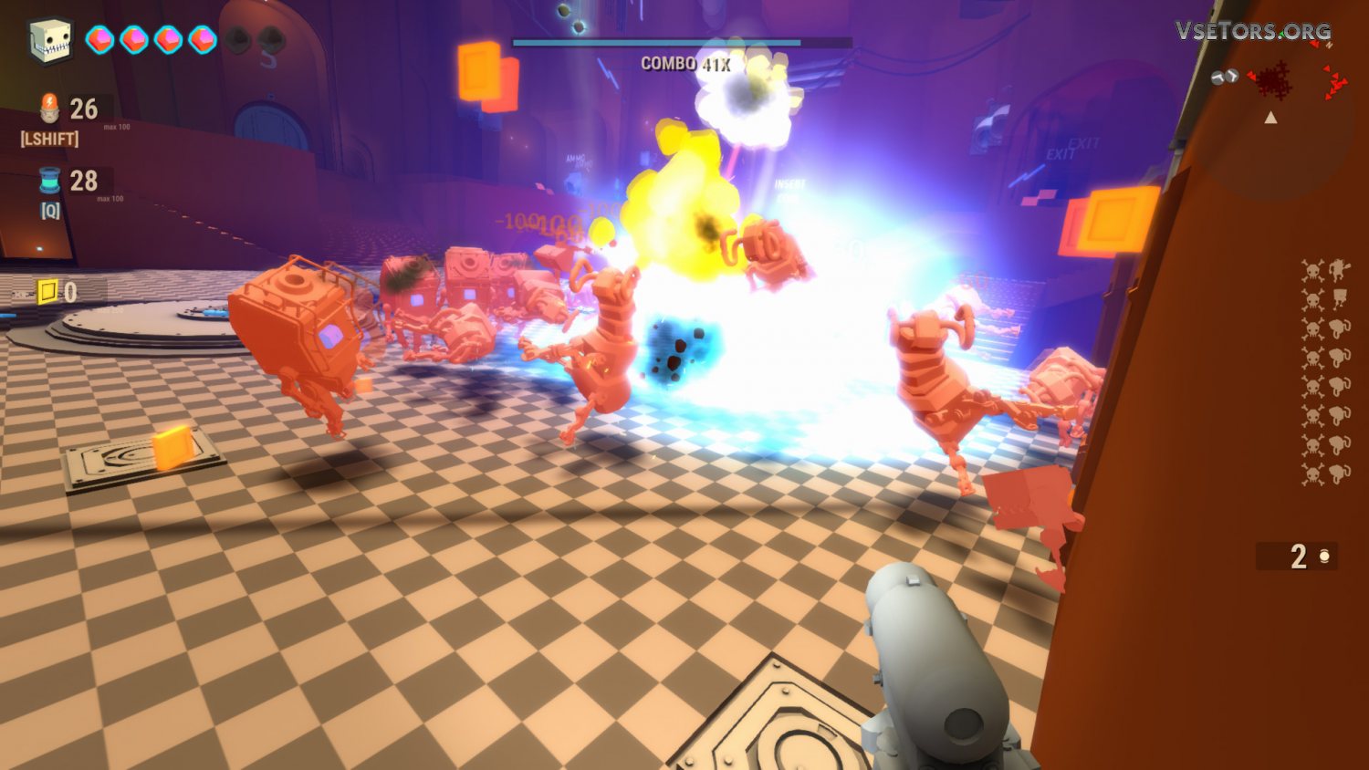 Оказавшись на арене, вы должны будете отстреливать орды врагов. Но не думайте, что будет легко. Во-первых, все враги разнятся, и каждый представляет собою нечто вроде робота, оснащенного разными вооружениями. К слову, разнообразие врагов тут достаточно велико – одни будут нападать с воздуха, другие бежать на вас с дубинами, третьи пытаться застрелить. Во-вторых, время от времени вам придется бить еще и с боссами – огромными роботами, гигантскими машинами, вооруженными до зубов. Ну а в-третьих, еще и сами волны будут становиться с каждым разом все больше и жестче.