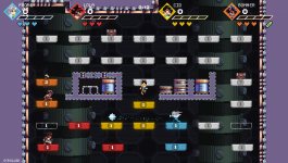 Игровой процесс в целом довольно прост. Есть персонажи, каждый из которых прикосновением окрашивает блоки в свой цвет. Есть уровни, двигающиеся вертикально, состоящие из рядов с блоками, которые как раз-таки и нужно окрашивать. И вот, вам нужно прыгать вверх и в бока, вправо или влево, стараясь разукрасить блоки в свой цвет, и не дав противнику сделать то же самое с вашими блоками в самый последний момент, перед тем, как блоки засчитаются. Постепенно скорость движения уровня увеличивается, и из-за этого становится конкурировать все сложнее…