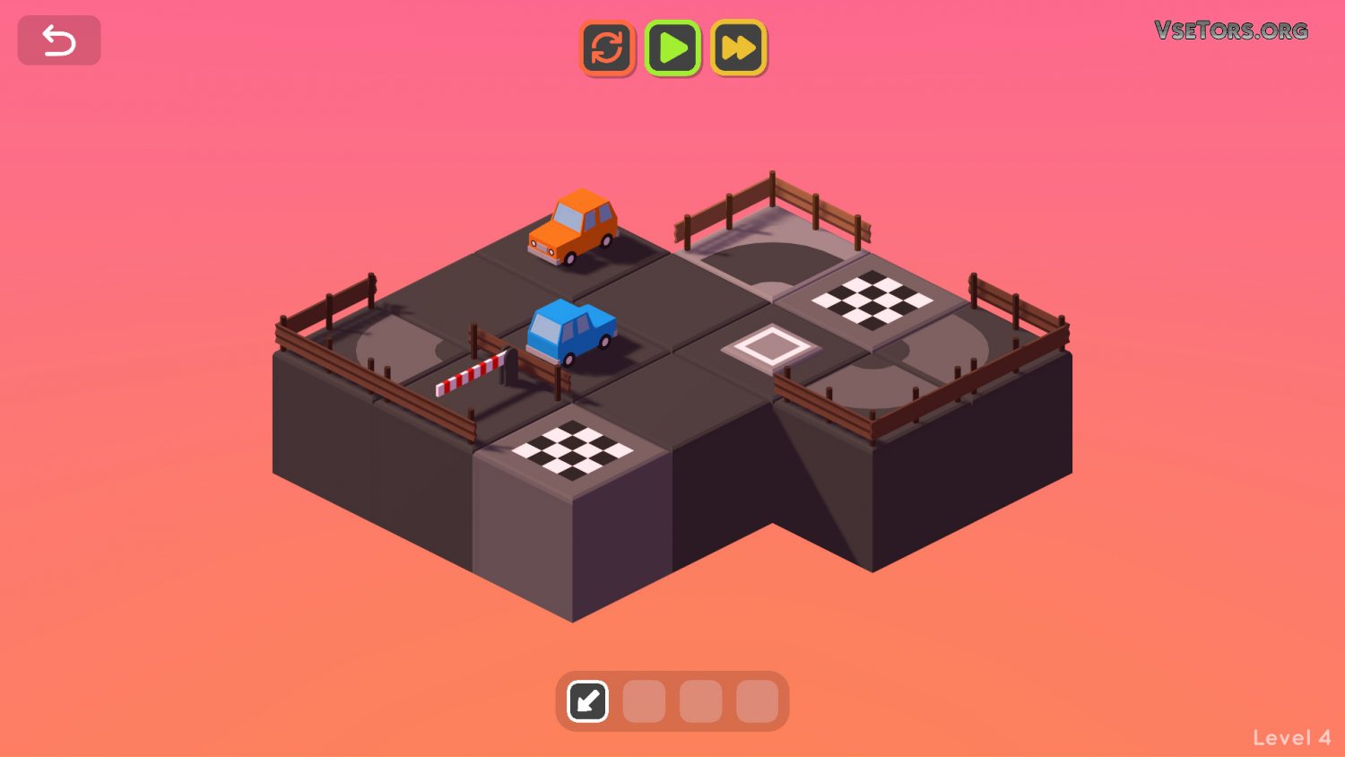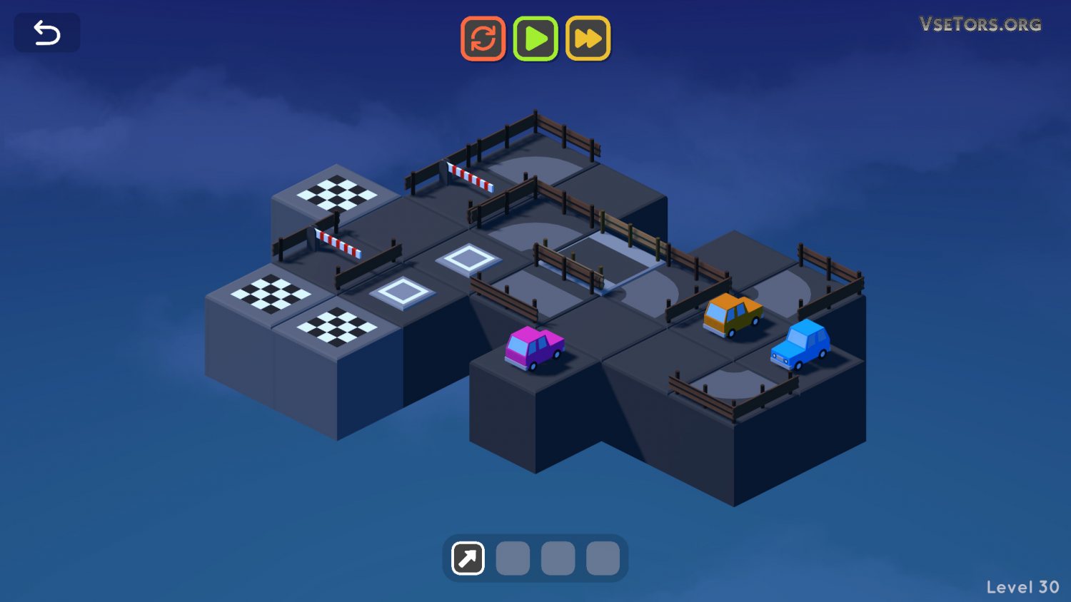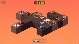 Каждый раз вы можете запускать автомобили, после чего они будут пошагово начинать двигаться. После перемещения на клетку движение останавливается, и тогда у вас есть возможность снова переместить все нужные вам фрагменты дороги. Ничего сложного, если не считать одного момента, который заключается в том, что все объекты на уровне двигаются одновременно, и нельзя запустить одну машину, оставив другую.
