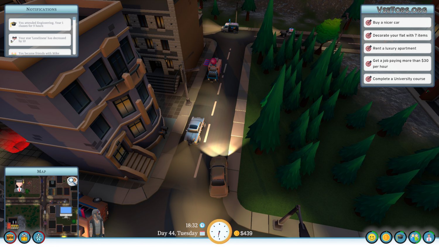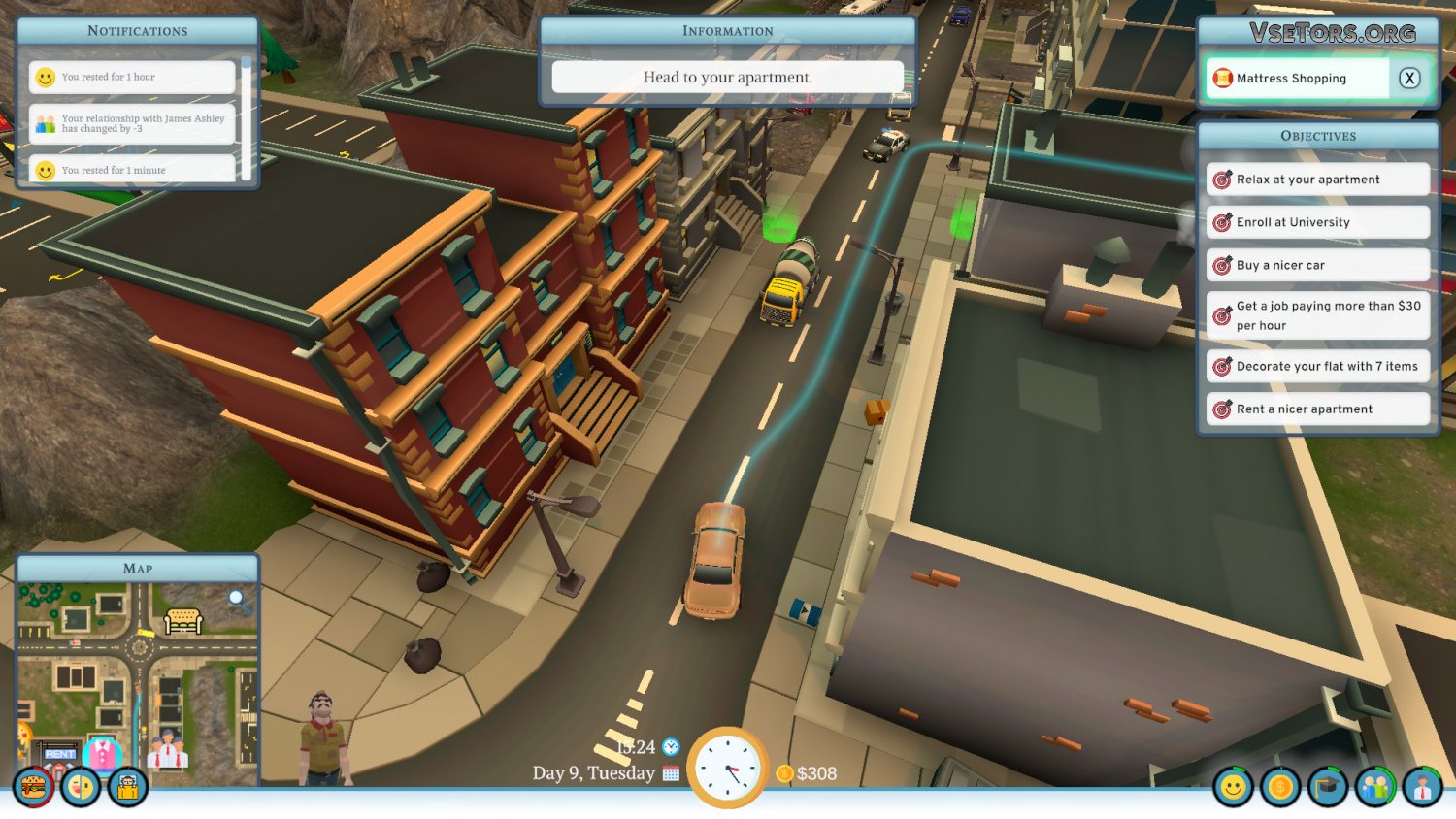 Самое же интересное тут то, что игра постоянно предлагает принимать решения, от которых в свою очередь будет зависеть вся жизнь персонажа. Например, вам нужно будет выбрать, где жить – вы можете снять номер в дорогом отеле, но тогда придется тратить все деньги на оплату, или же арендовать дешевую квартирку на краю города, сэкономить, но оказаться вдали от центра и работы. И вот таких вот решений тут придется принимать очень много.