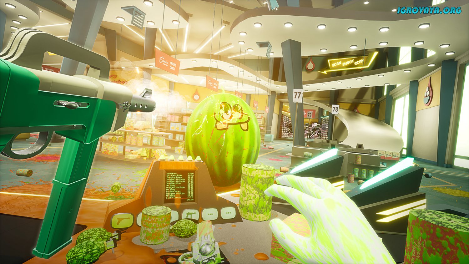 Сначала вы станете кассиром и будете решать соответствующие задачи, вроде сканирования продуктов, что будут продаваться, подачи блюд посетителям. Но уже через время на вас начнут нападать фрукты, от которых придется отстреливаться из специального оружия. Со временем же вы поднимитесь по карьерной лестнице, сможете обзавестись куда более крутым вооружением, и сделаете много полезных вещей.