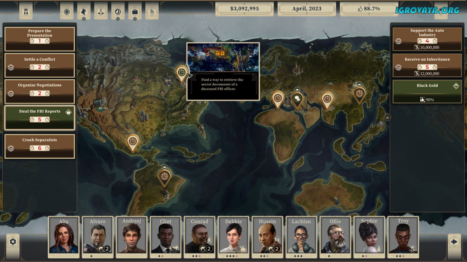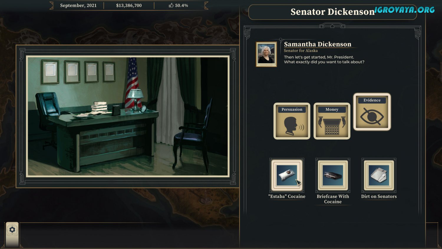 Темные делишки тоже будут присутствовать. Хакеры, журналисты, вышибалы и лоббисты, специалисты в более незаконных и опасных сферах – все они станут вашими верными помощниками в борьбе за власть. Плюс, в This is the President вас ждет много рандомных событий, с которыми вам, как президенту, тоже придется разбираться. У нас вы можете скачать This is the President торрент последнюю версию бесплатно на компьютер.