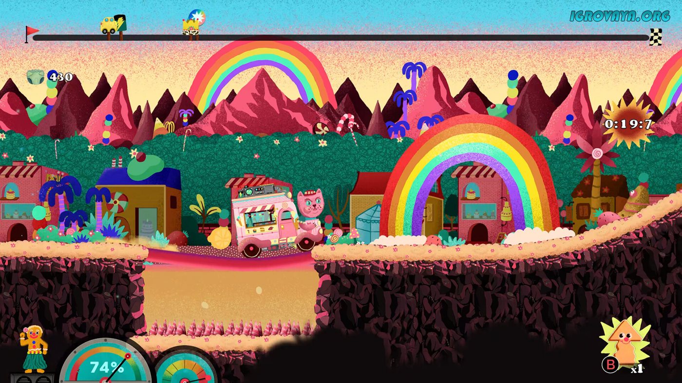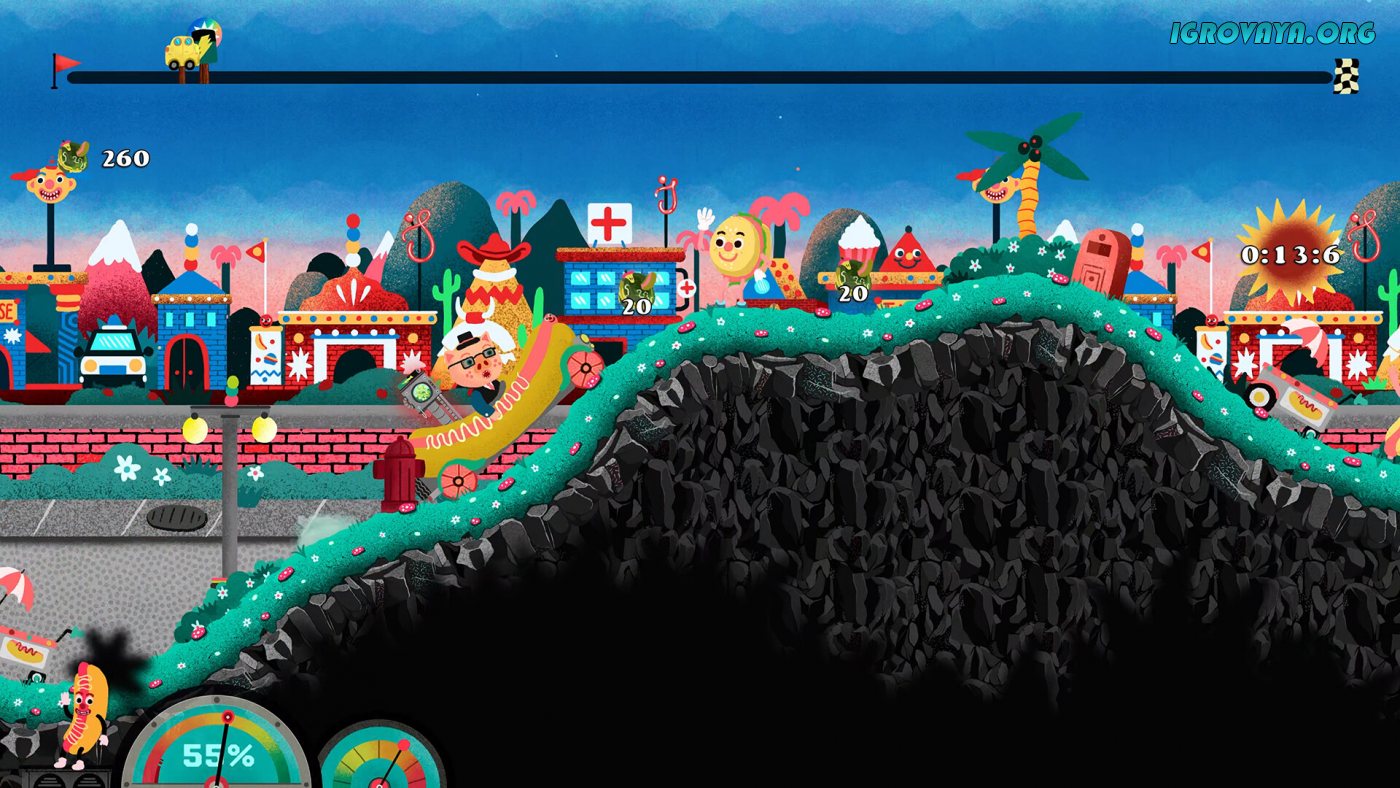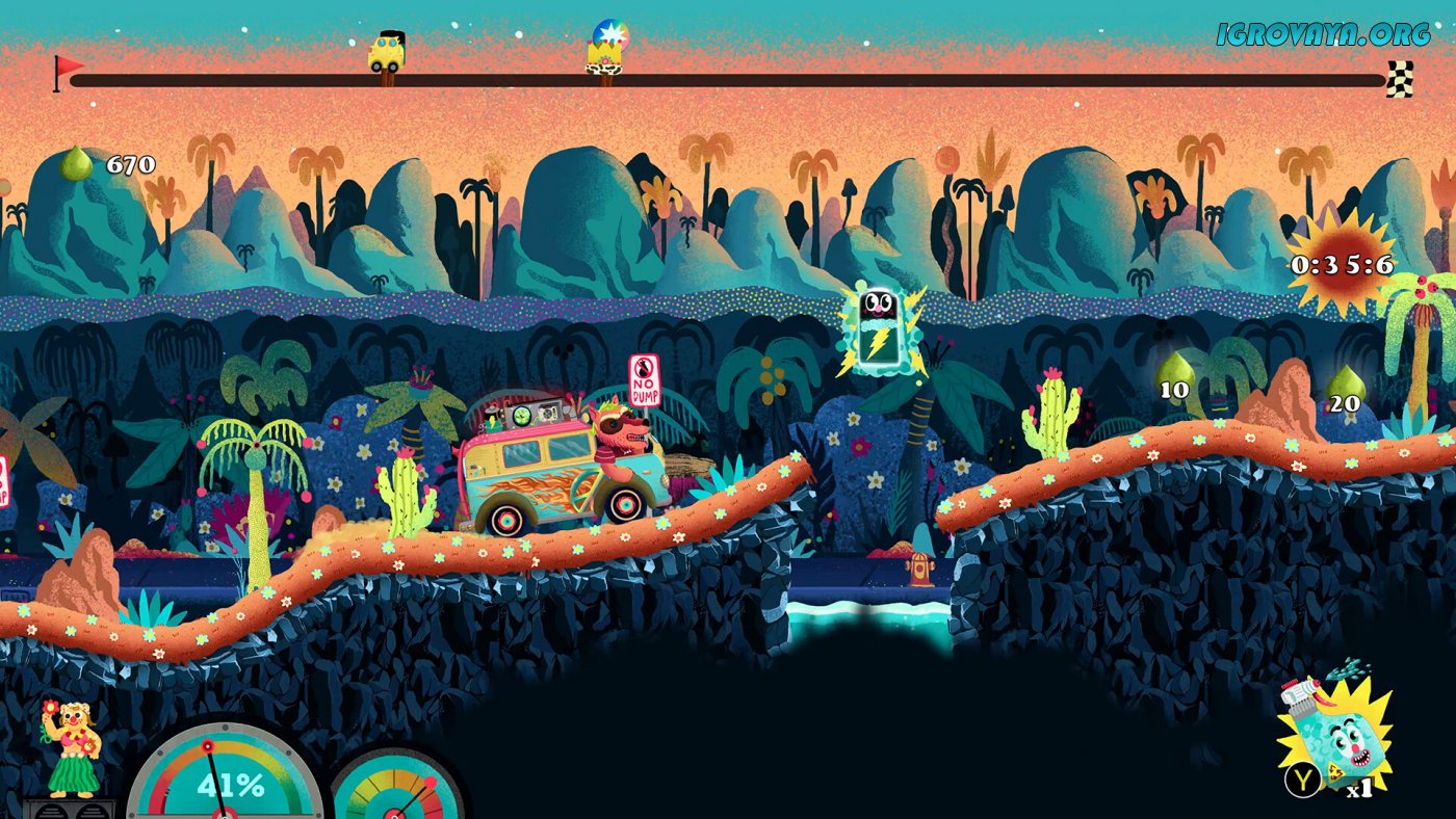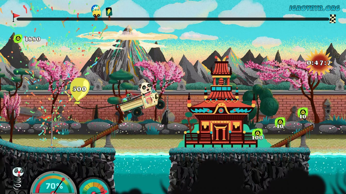 В вашем распоряжении будет более десятка уникальных уровней-трасс, на каждом из которых вас будут ждать различные испытания, сложные задачи, преграды в виде монстров и боссов, и не только. Где-то вам придется прыгать по платформам и взбираться, используя лошадиные силы автомобилей, на возвышенности, а где-то придется убегать от монстров. Кстати, делать все это можно, как в обычном, так и в кооперативном режиме. Есть и соревновательный режим, в котором вы и компаньон будете соревноваться, управляя разными автомобилями, и преодолевая преграды.