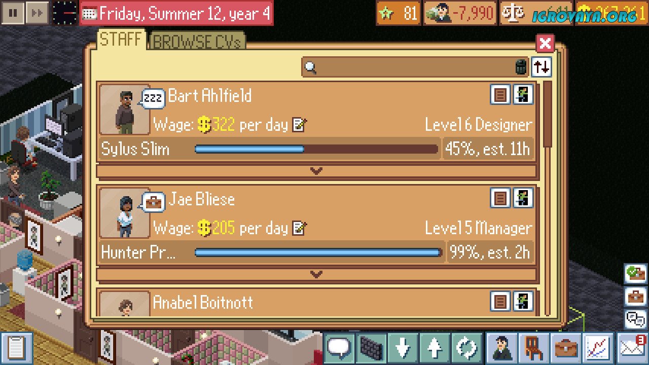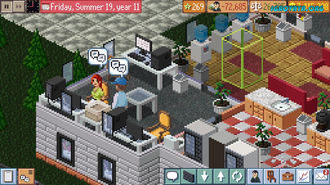 В вашем распоряжении окажется огромный офис, и вы теперь должны сделать так, чтоб он работал, как часы, чтоб весь коллектив приносил пользу, чтоб заработки увеличивались и производство техники шло вверх. Что для этого нужно? Ну как минимум для начала нужно собрать как можно больше полезных сотрудников. При этом, учтите и то, что каждый сотрудник уникален, и у всех имеются свои недостатки, цели, пожелания. Кто-то хочет все время покинуть рабочее место и отправиться к коллеге просто поболтать, кто-то вечно плетет интриги за спинами начальников, а кто-то и вовсе избегает работы. Вам нужно следить за сотрудниками, решать, кого из них наградить, а кого оштрафовать, а кого вообще уволить, если потребуется.