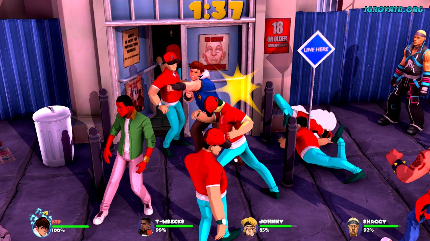 Mad Streets — веселая многопользовательская экшен игра с упором на комичные кулачные бои, где игроки сражаются всем, что есть под рукой: от изученных физических приемов до предметов окружения. Переместитесь в Гутсфордский университет - место, где обитают самые крутые ученики города. Выберите своего бойца: спортсмена, панка или богательного мальчика и покажите на что способны.