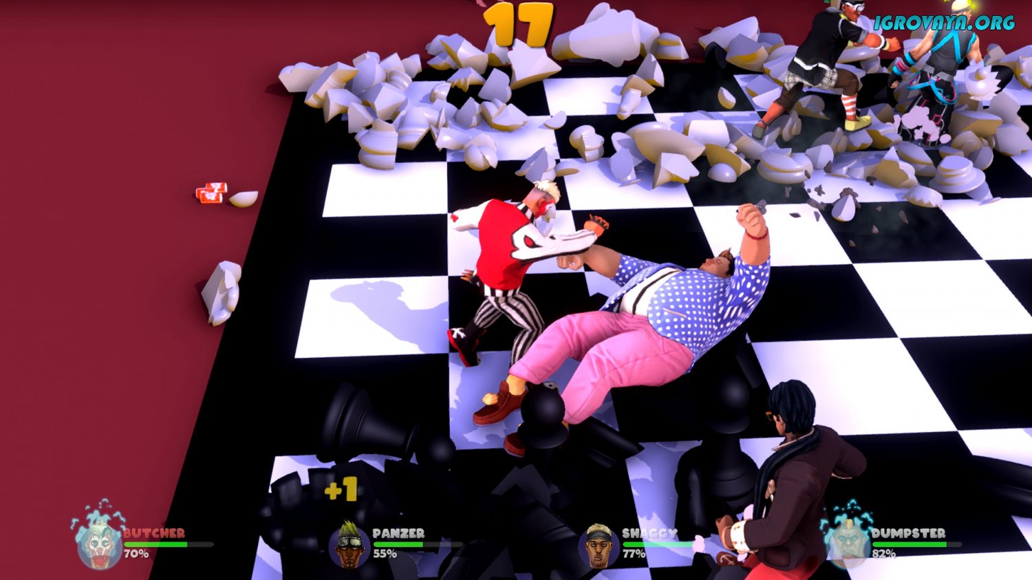 Реалистичная физика и анимация - вот ради чего точно стоит сыграть. Наносите точные удары в определенные места и следите за забавными анимациями. Смотрите под ноги и не подскользнитесь на упавшем предмете! Устраивайте мочилово как один на один, так и объединяясь в группы. Игра будет одинаково интересна тем, кто решит пройти ее с друзьями или ботами. Освойте все фишки и комбо для преимущества в бою. Вовремя уклоняйтесь от вражеской атаки, чтобы ошеломить противника. У каждого из персонажей будет свой уникальный прием, так что открывайте всех героев и найдите своего любимчика.