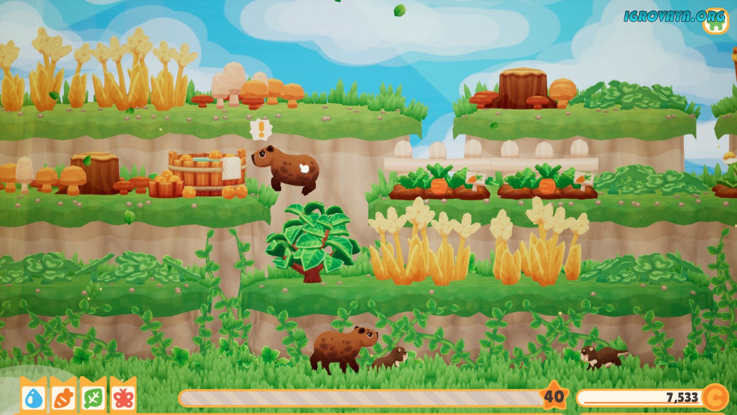 Первые посетители - это всегда волнительно. Вам предстоит непростая задача по восстановлению спа на склоне горы. Очищайте заросшие участки и возводите новые постройки. В режиме обучения вам подробно расскажут как обходится с четвероногими гостями. Начните с одной капибары: сделайте для нее ванну и даже грядку, чтобы накормить и получить за это первые золотые монеты. Они - единственная возможность на улучшение вашего бизнеса. Чем больше гостей вы сможете принять, тем больше сможете заработать. Вместе с капибарами к вам придут и их друзья: утки, выдры, лягушки и черепахи. Помещайте их в одно джакузи и наблюдайте за их взаимодействием друг с другом.