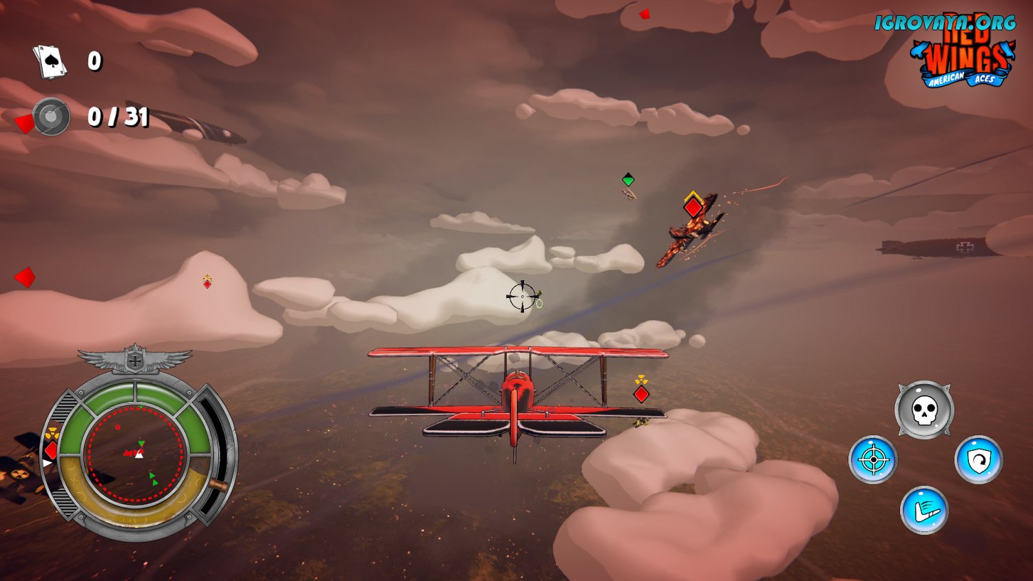 Готовы показать свой навык на мировой арене? Сразитесь по сети против настоящих игроков за звание аса Red Wings. Вас ждут шесть командных и три настраиваемых режимов: в первом случае вы ведете бой с людьми, а во втором у вас уже есть выбор - тренироваться с ботами или пригласить друзей для игры по локальной сети. У нас вы можете скачать Red Wings: American Aces торрент последнюю версию бесплатно на компьютер.