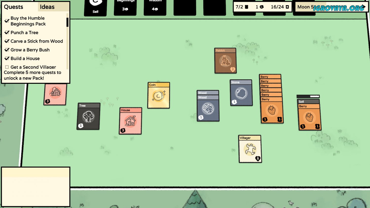 Скачать Stacklands вы можете уже сейчас с нашего сайта и приступить к созданию своего поселения. Изначально геймер получает несколько карт и проходить обучение в виде простых заданий. Игровая механика заключается в том, что необходимо перемещать карты друг на друга и наблюдать за получившимся результатом. Например, если положить «Жителя» на «Ягодный куст», то он соберет ягоды, а при размещении его же на дереве получится древесина.