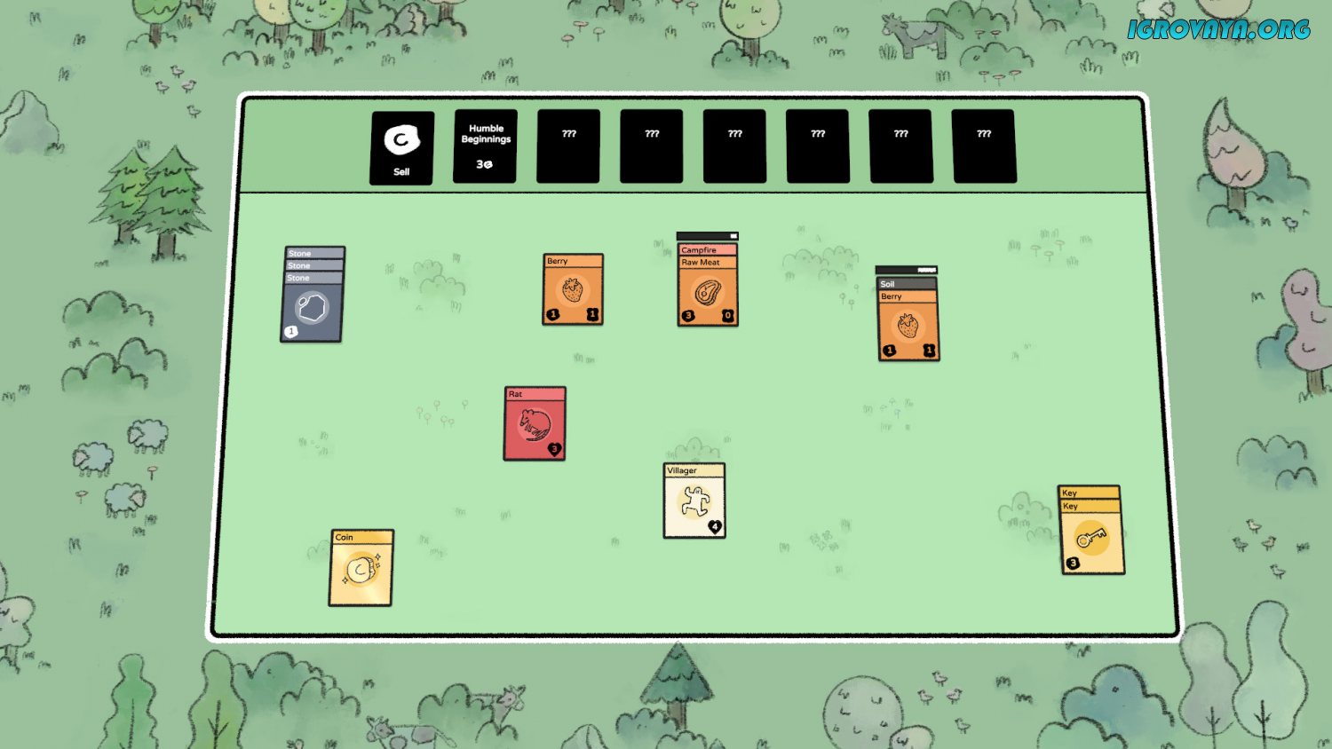 Управление интуитивно понятно и не потребуется много времени в его освоении. Больше всего уйдет на подбор комбинаций. Всего в игре представлено более 100 карт, которые выпадают на поле в случайном порядке. Находите необычные связки, чтобы развивать небольшую общину, плавно превращающуюся в деревню.