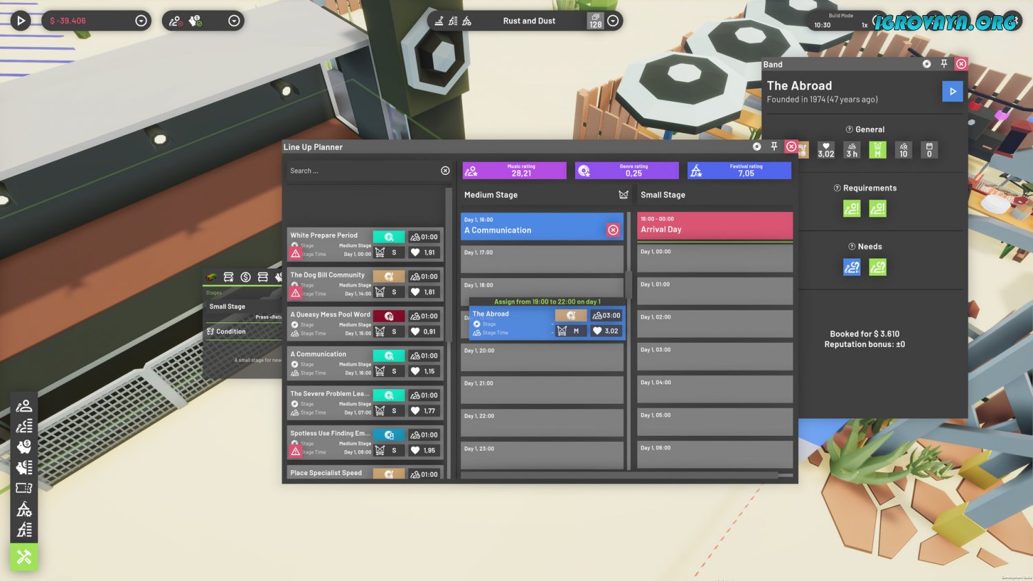 Какой фестиваль без музыкальных групп? Выбирайте представителей из представителей фолка, рока и техно. Сделайте декор под стать жанру и договоритесь с группами об условиях приезда. За некоторыми из них придется буквально бегать по пятам, иначе они просто уедут в разгар веселья и сорвут все шоу. У нас вы можете скачать Festival Tycoon торрент последнюю версию бесплатно на компьютер.