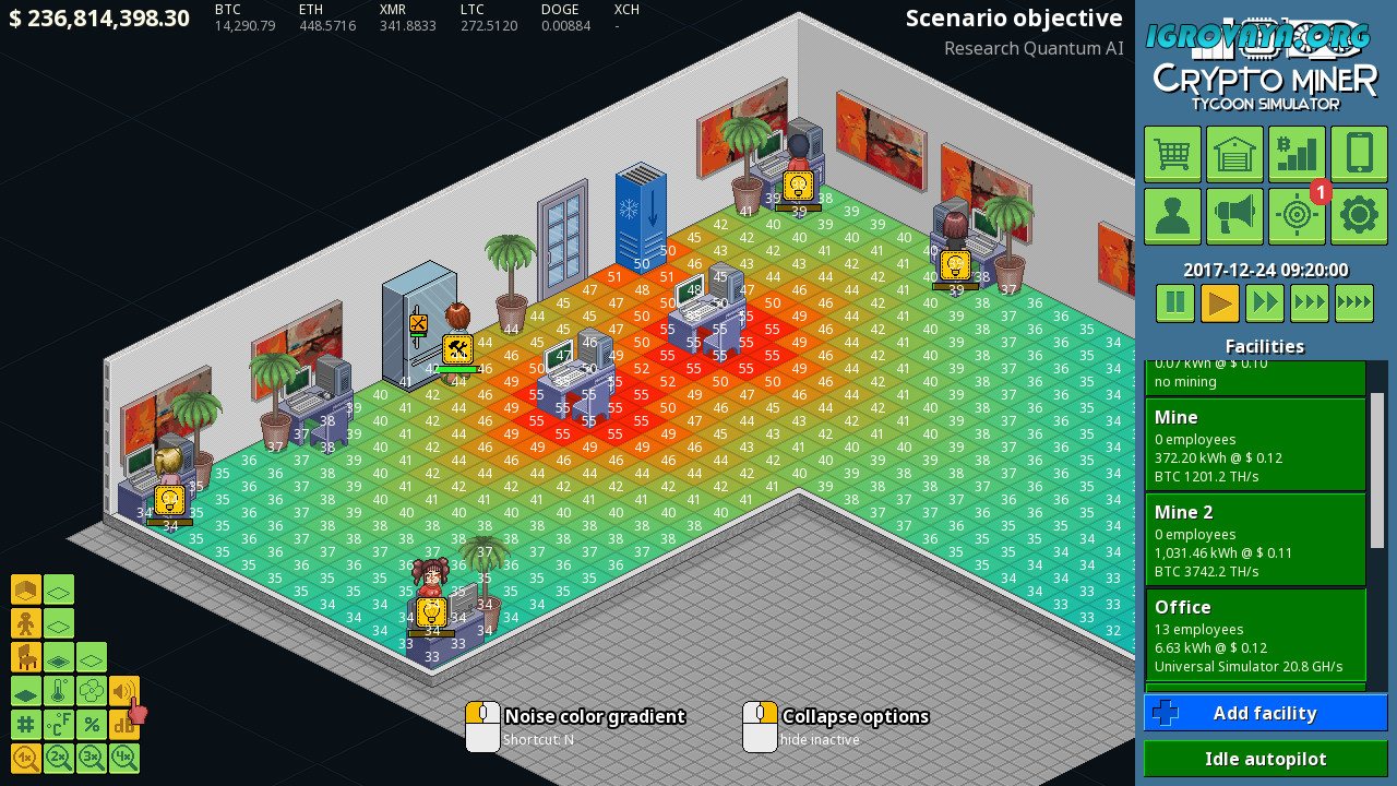 Crypto Miner Tycoon Simulator — реалистичный симулятор по созданию и продвижению бизнеса по добыче криптовалюты. Начните из комнаты главного героя в далеком 2010 году и застаньте расцвет майнинга. Постройте первую ферму будучи подростком в своей комнате, а после вырастите до гигантской корпорации с несколькими офисами и огромными серверными.