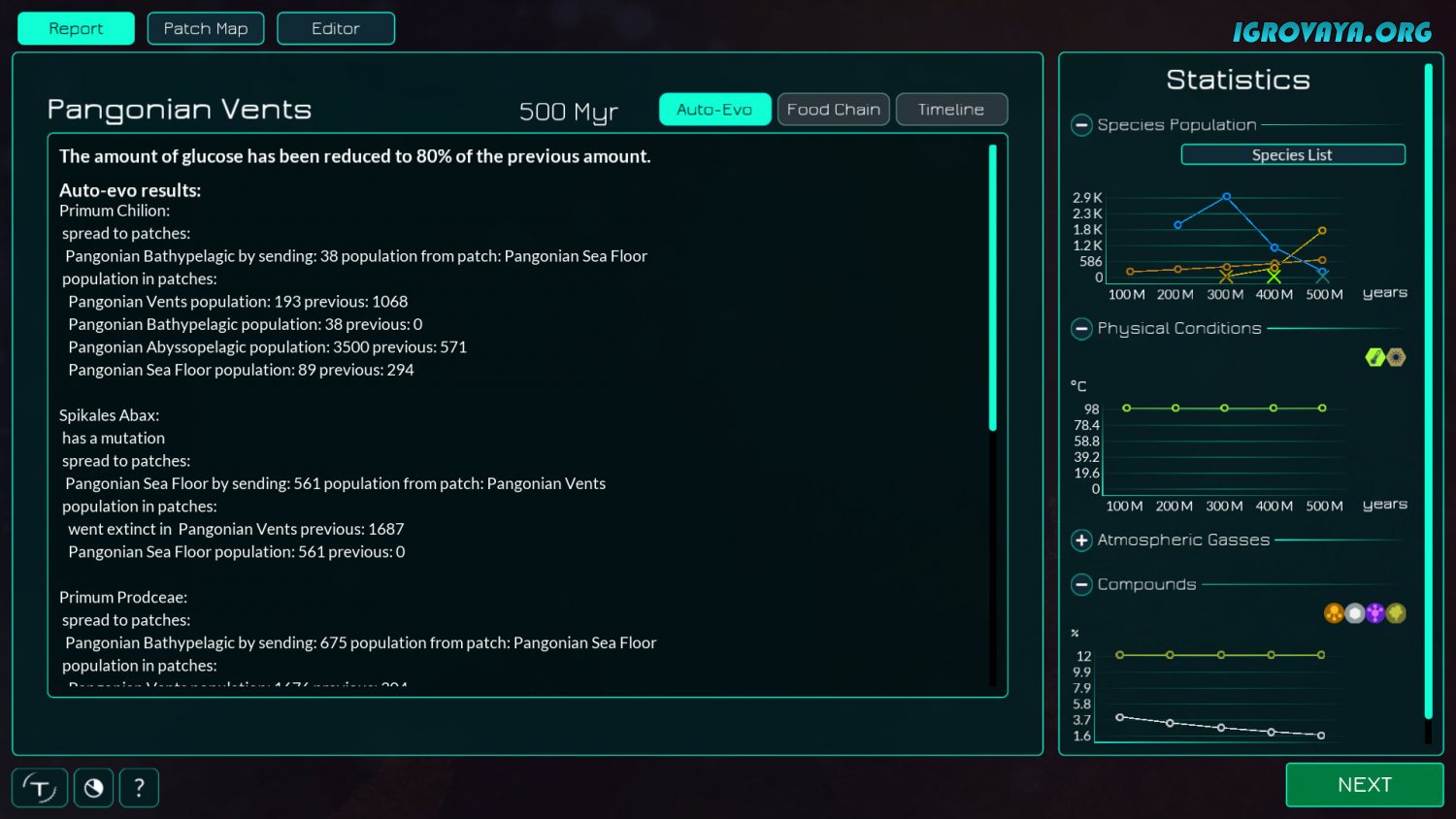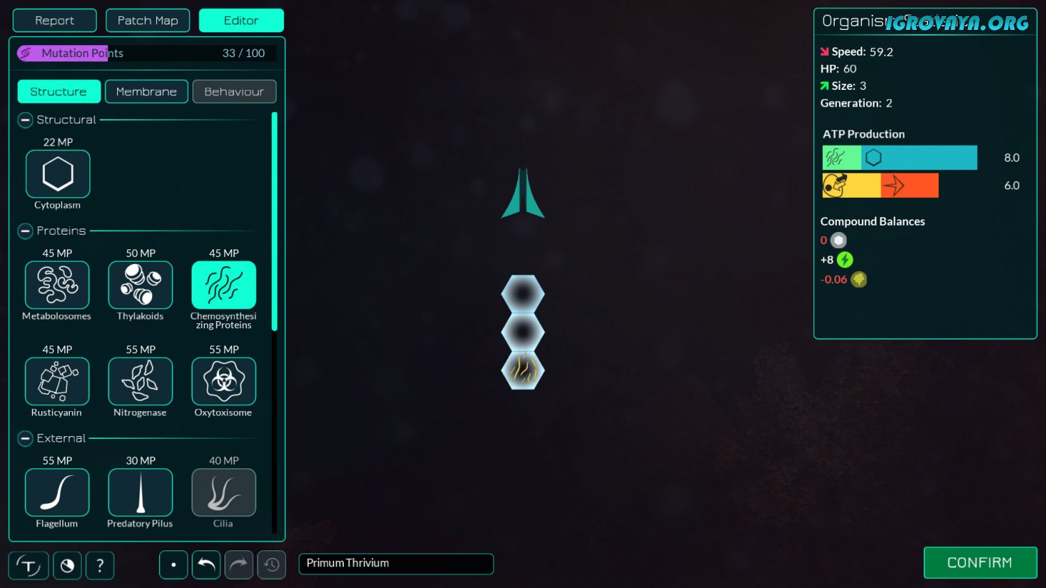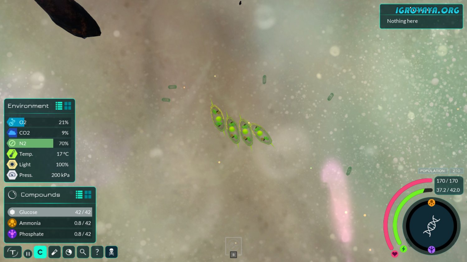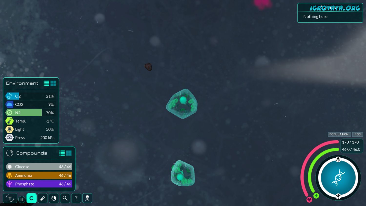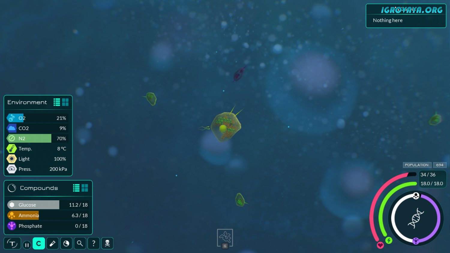Чем сложнее ваш организм — тем больше выбора. Можно встроить жгутики для скорости, отрастить шипы для защиты или вовсе перейти на фотосинтез и спокойно парить у поверхности. Но за всё придётся платить: энергией, эффективностью, уязвимостью к новым угрозам. Система ресурсов — не абстрактные цифры, а настоящие химические соединения, от фосфатов до глюкозы, и их баланс определяет успех вашего вида. А ещё вокруг постоянно появляются конкуренты, реальные и непредсказуемые — искусственный интеллект управляет их развитием, заставляя мир реагировать на ваши действия.