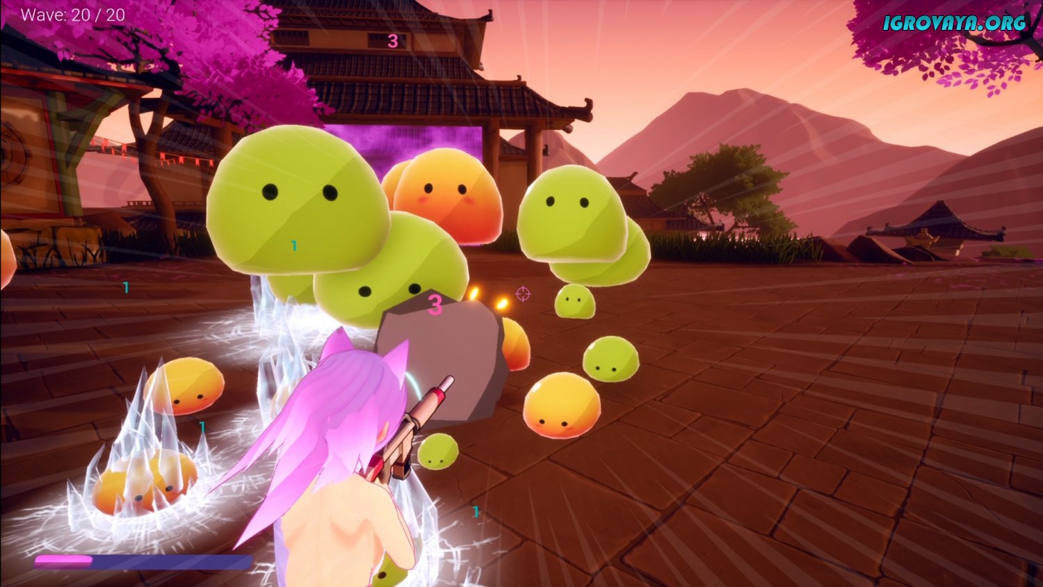 Сами враги бывают нескольких видов и с каждой волной появляются более усиленные вариации. Небольшие слаймы можно уничтожить с одного удара, а для уничтожения тех, что побольше, потребуется больше патронов. Будьте бдительны и не дайте окружить себя, иначе они легко расправятся с вами и придется начинать заново.